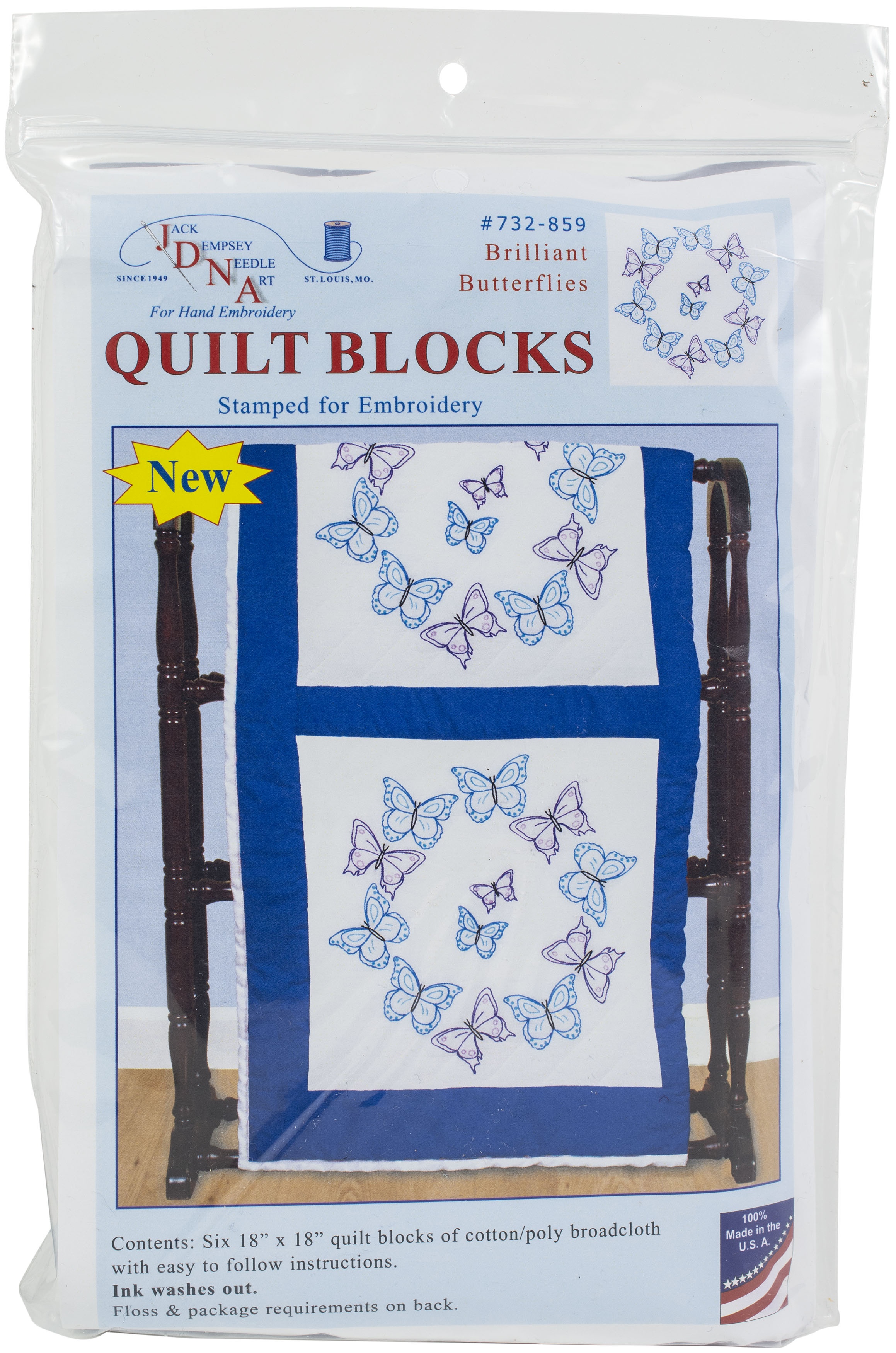 Create a beautiful quilt top using this great kit. It consists of individual squares to stitch and join together to form a quilt top. The stitching designs have been stamped using ink that washes away with any liquid and the fabric is a cotton/poly blend broadcloth. This package contains six 18x18 inch quilt squares, instructions for completion and care and complete list of DMC floss requirements. Fabric, backing, needle, thread and floss all sold separately. Design: Brilliant Butterflies. Made in USA.