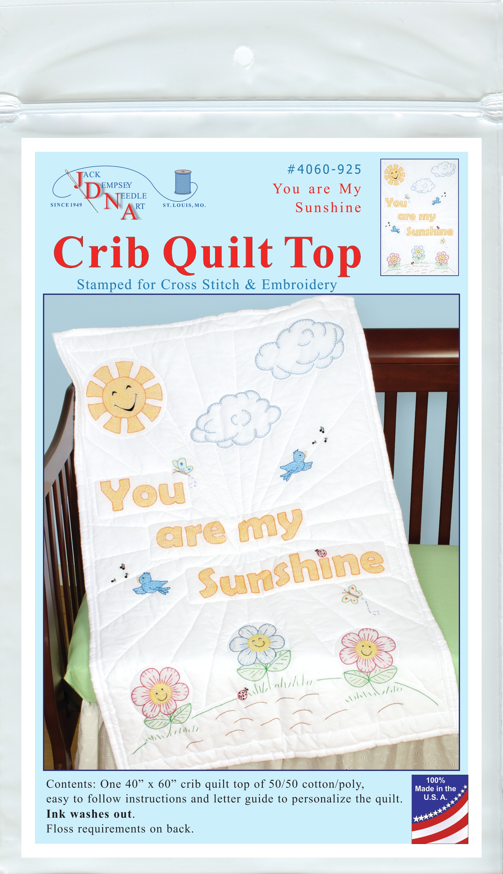 Package contains (1) 40"X60" 50% Cotton/50% Polyester crib quilt top stamped in blue ink, floss requirements, instructions and a list of additional materials needed to complete the quilt.