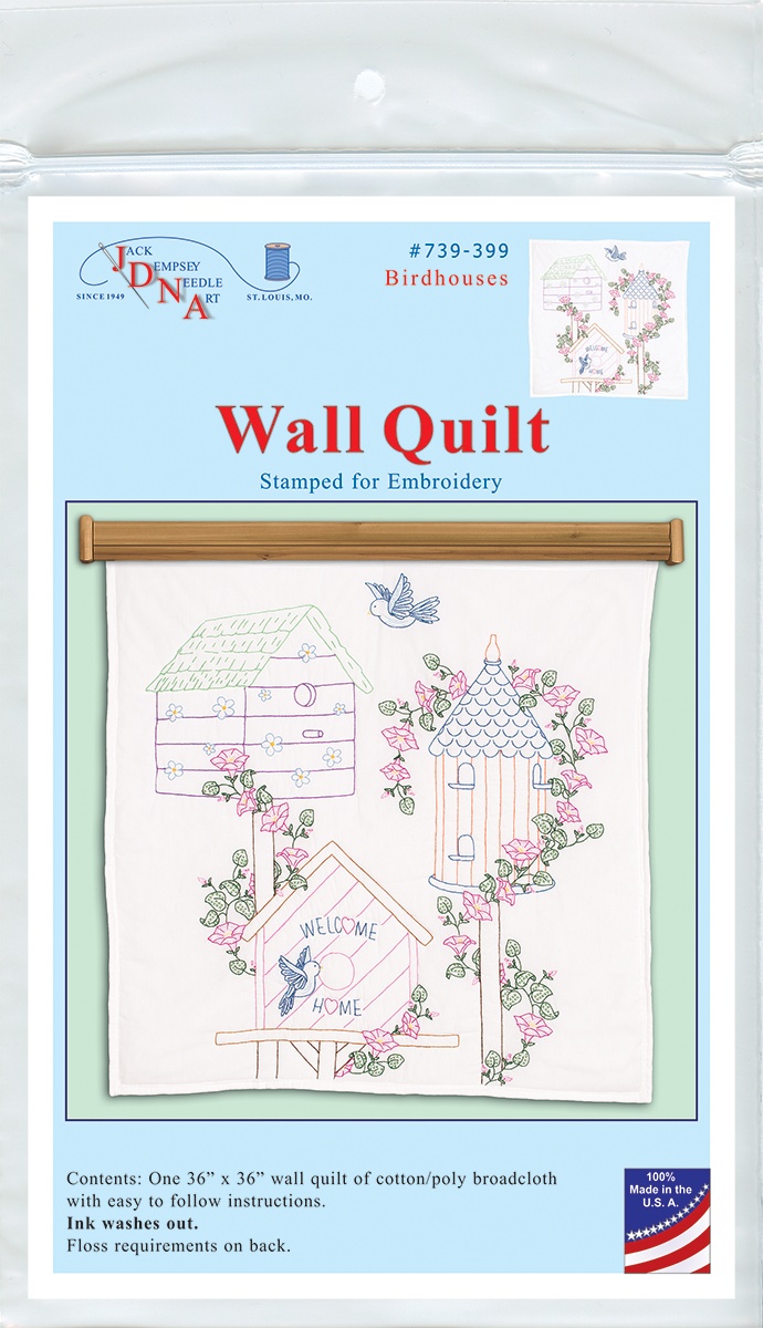 JACK DEMPSEY-Stamped Embroidery: Wall Quilt. Each package contains one 36x36in wall quilt of cotton/poly broadcloth, instructions for completion and care, and complete floss requirements. Design: Birdhouses. Made in USA.
