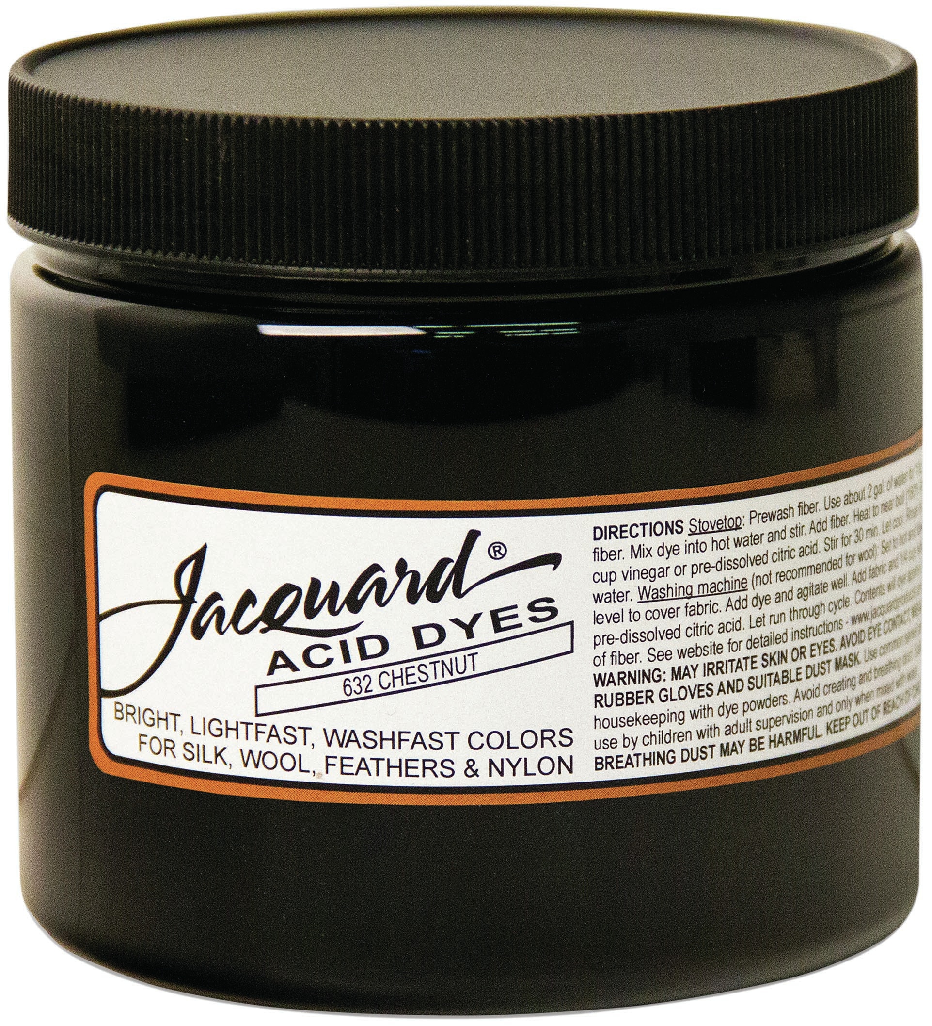 Acid dyes are used to color silk, wool, feathers, other protein fibers and nylons, and nothing does it better! Extremely brilliant and colorfast, Jacquard Acid Dyes are highly concentrated, powdered hot water dyes that produce level, uniform color during immersion dyeing. They exhaust well and won't bleed or fade with washing. Acid dyes are known to produce the most luscious colors of all, and Jacquard's palette is unsurpassed for quality, intensity and consistency. Dyes May be used for direct painting or printing applications in addition to yarn, fiber and fabric dyeing. Don't be alarmed by the name, the only acid involved is the white vinegar or citric acid that you add to the dye bath. Colors vary in price due to the high quality natural pigments used in each dye. This package contains 8 ounces of dye. Made in the USA.