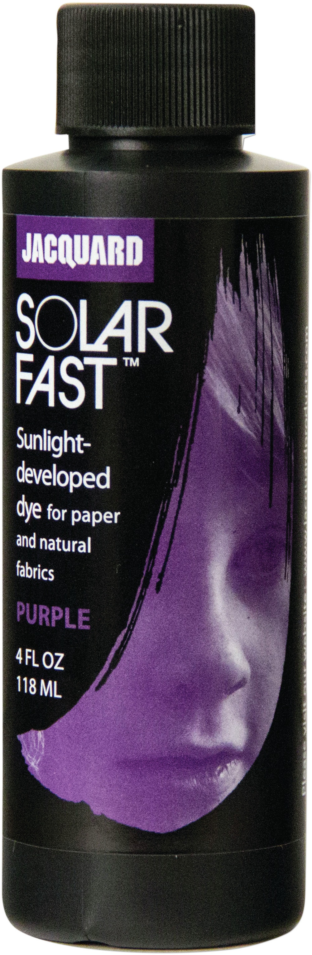 SolarFast dyes are light-sensitive and only develop color and become permanent upon exposure to sunlight (UV). This unique property means SolarFast may be used to create remarkably detailed photographs, photograms and shadow-prints on paper or fabric by harnessing the power of the sun! Anything you place on the painted surface to block the light will create a print in a matter of minutes, whether that's a solid object, a photographic negative or shadow. SolarFast is also great for painting, tie dyeing, screen printing, stamping, batik and more