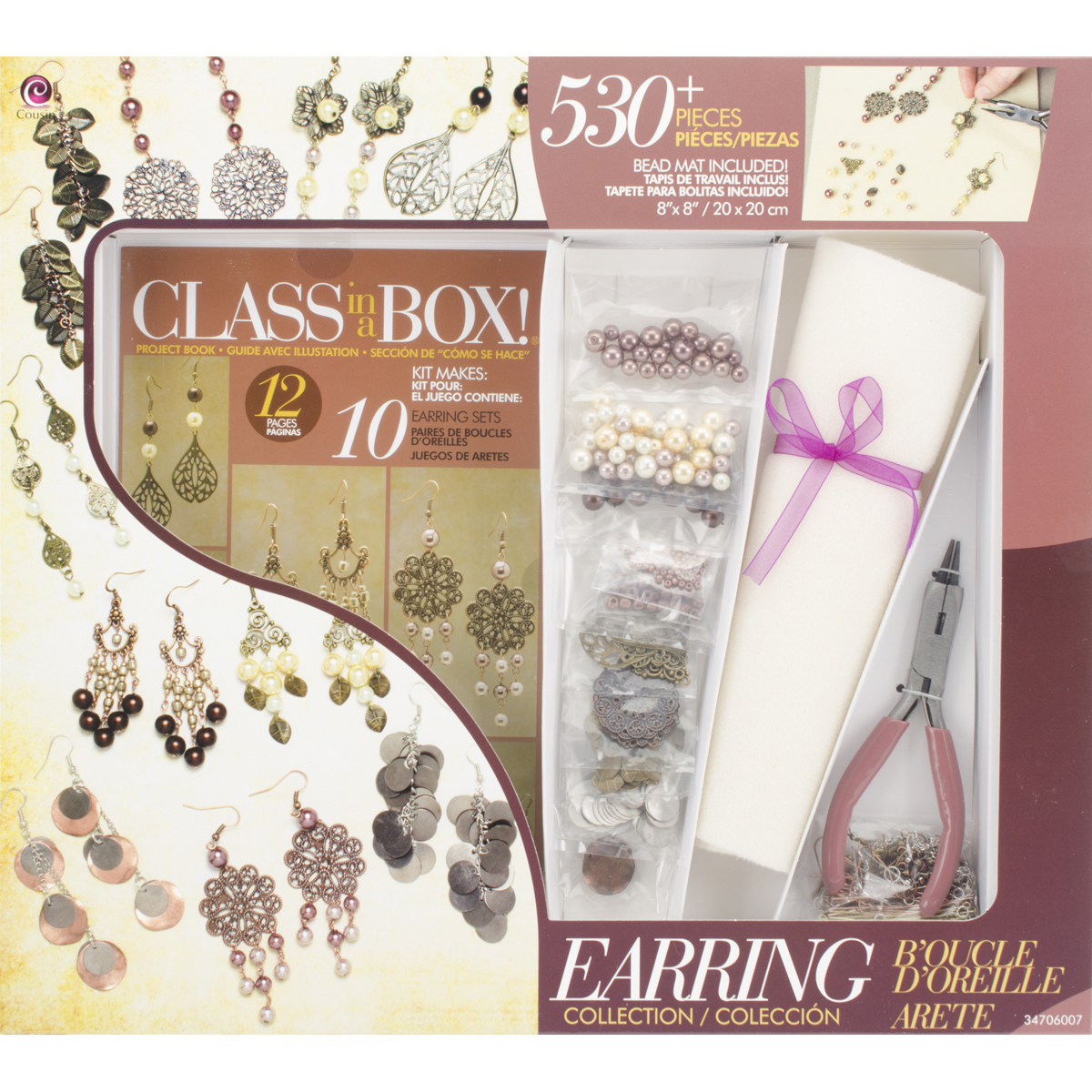 COUSIN-Jewelry Class in a Box Kit. Learn simple and exciting techniques to make jewelry just like you see in department stores! Cousin's Jewelry Class in a Box kits are the perfect solution for everything you need to create fantastic jewelry with professional results. Clear photos and illustrations will take you step-by-step through each technique and all the tools and supplies you need are included! Each Jewelry Class in a Box kit contains one 3-in-1 Jewelry Tool, one 8x8 inch bead mat, assorted beads and findings for completing the projects, and one project book. Available in a variety of themed kits: each sold separately. Number, color, and style of projects per kit varies by theme. Imported.