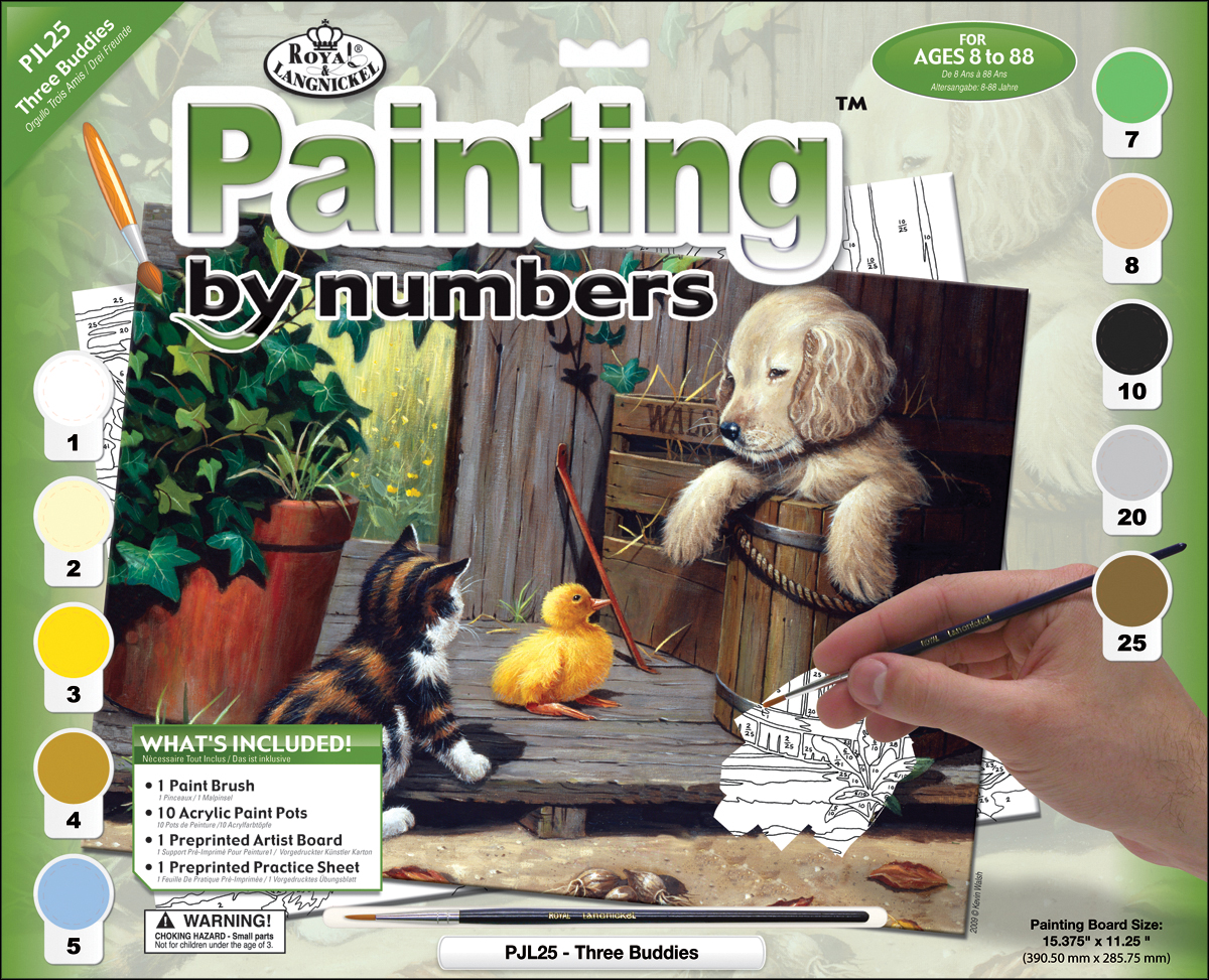 ROYAL BRUSH-Junior Large Paint By Number Kit. These creative and brightly colored images are the perfect paint by number kit for rainy day projects. These kits contain one 15-1/4x11-1/4in pre- printed board, acrylic paints, brush and instructions. Available in a variety of themes. Conforms to ASTM D4236. Recommended for children ages 8 and up. WARNING: Choking Hazard-small parts. Not for children under 3 years. Imported. Hazard-small parts. Not for children under 3 years. Imported.