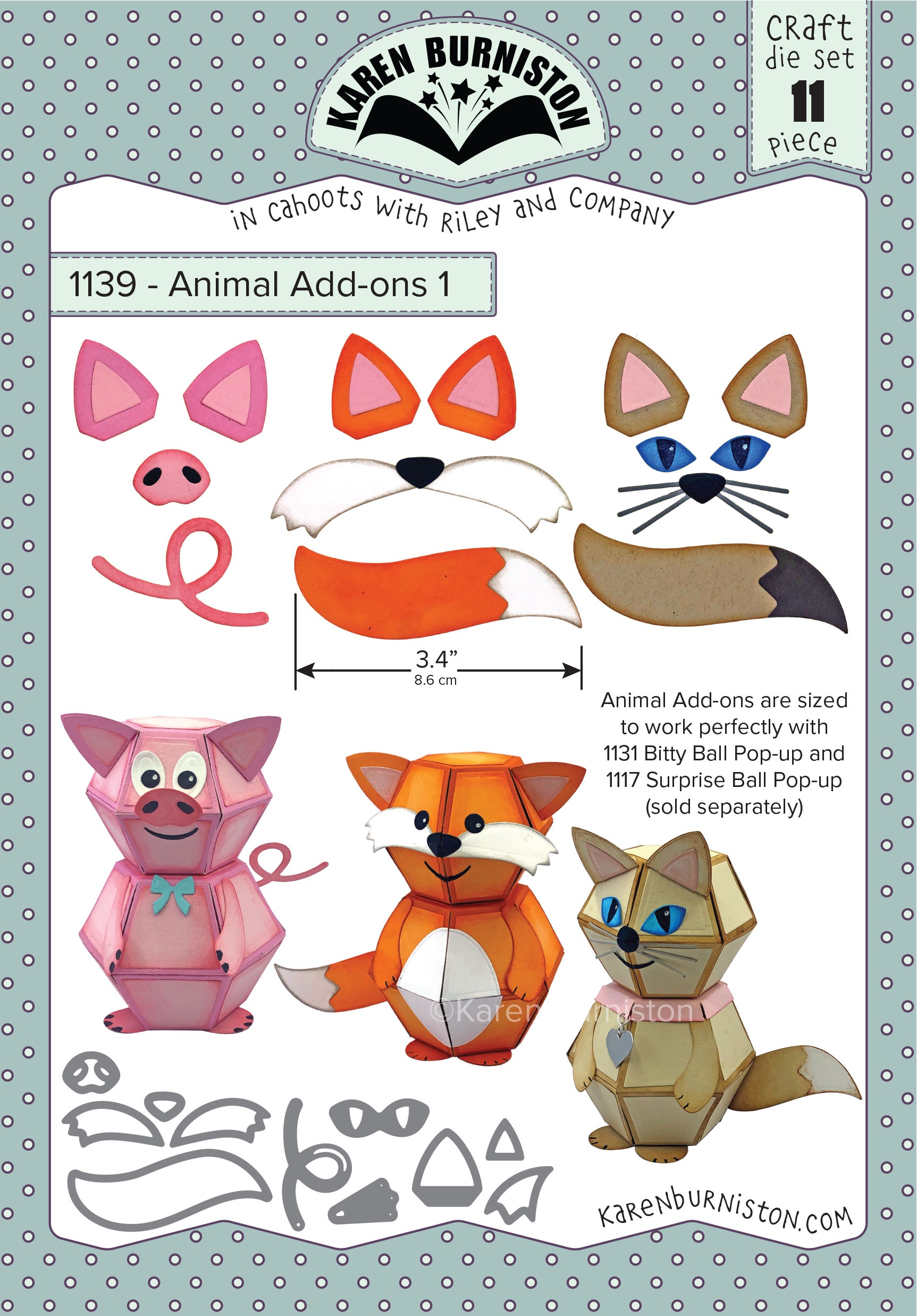 Our wafer-thin metal crafting dies are compatible with most major die cutting machines. Packed with value, these innovative, cutting edge die sets will take your paper crafting to new heights. NOTE: Animal Add-ons are meant to be used with Bitty Ball Pop-up (with or without Surprise Ball Pop-up). Use the pieces included in the Bitty/Surprise Ball pop-up dies for eyes, arms, feet and pet tags. Made in the USA.