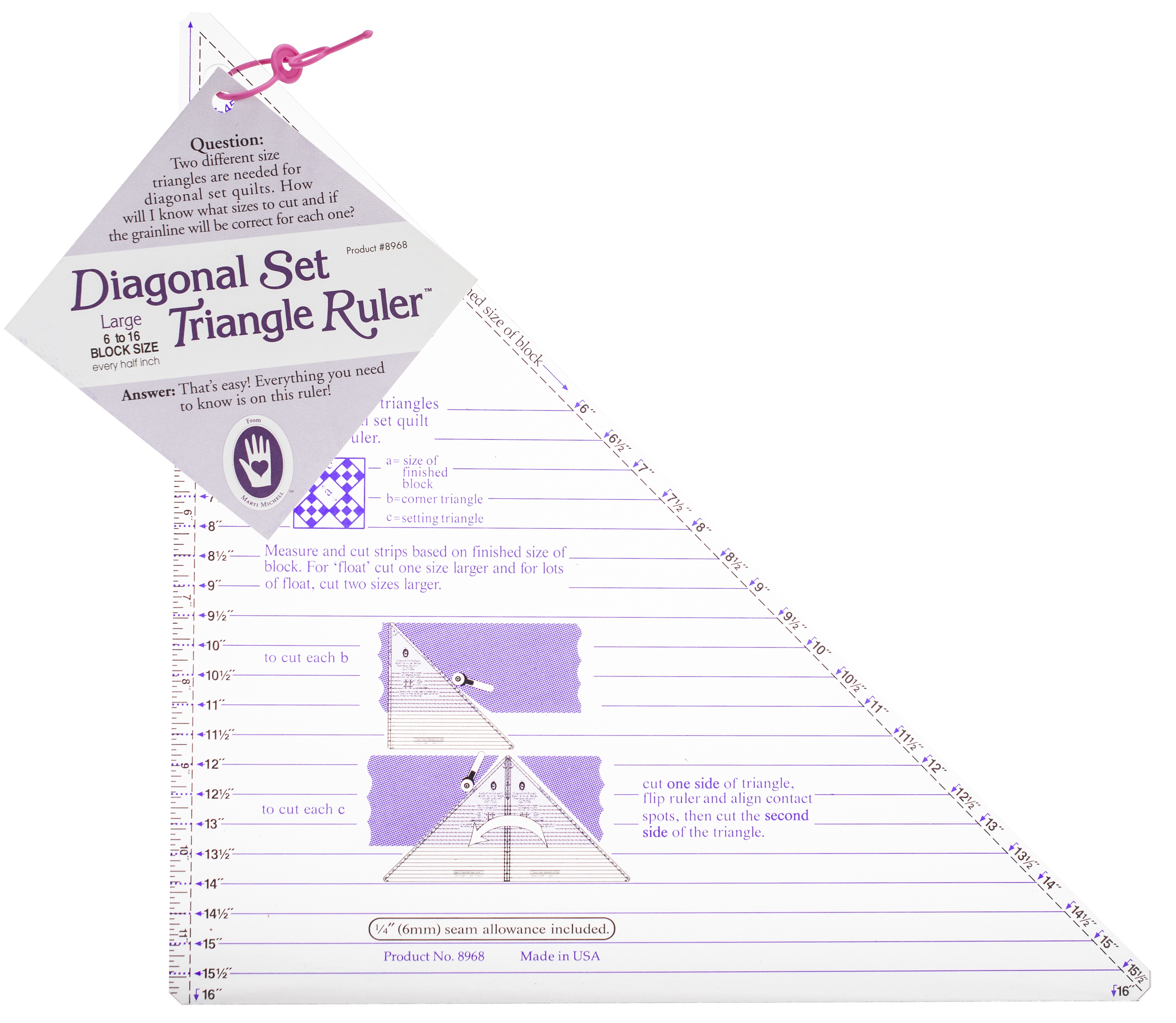 MARTI MICHELL-Large Diagonal Set Triangle Ruler. Use this ruler to cut triangles for diagonal-set quilts, borders and blocks! This package contains one 12x12 inch diagonal set triangle ruler with six inch and sixteen inch blocks. Made in USA.