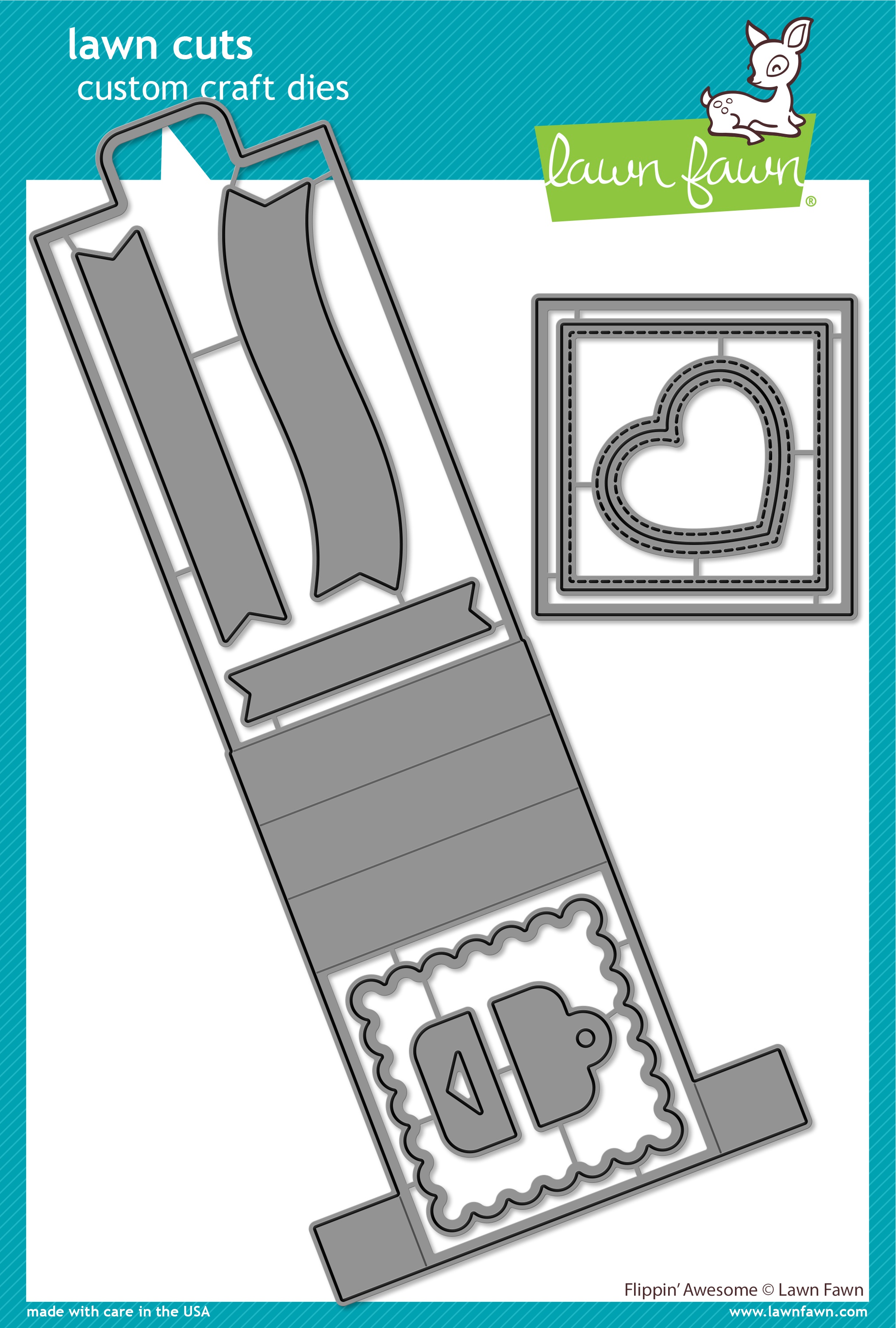 Lawn Fawn custom craft dies are made of 100% high-quality steel, compatible with most die-cutting machines, and will inspire you to create cute crafts! This package contains Flippin' Awesome, ten dies. WARNING: Choking Hazard- small parts. Not for children under 3 years. Made in the USA.