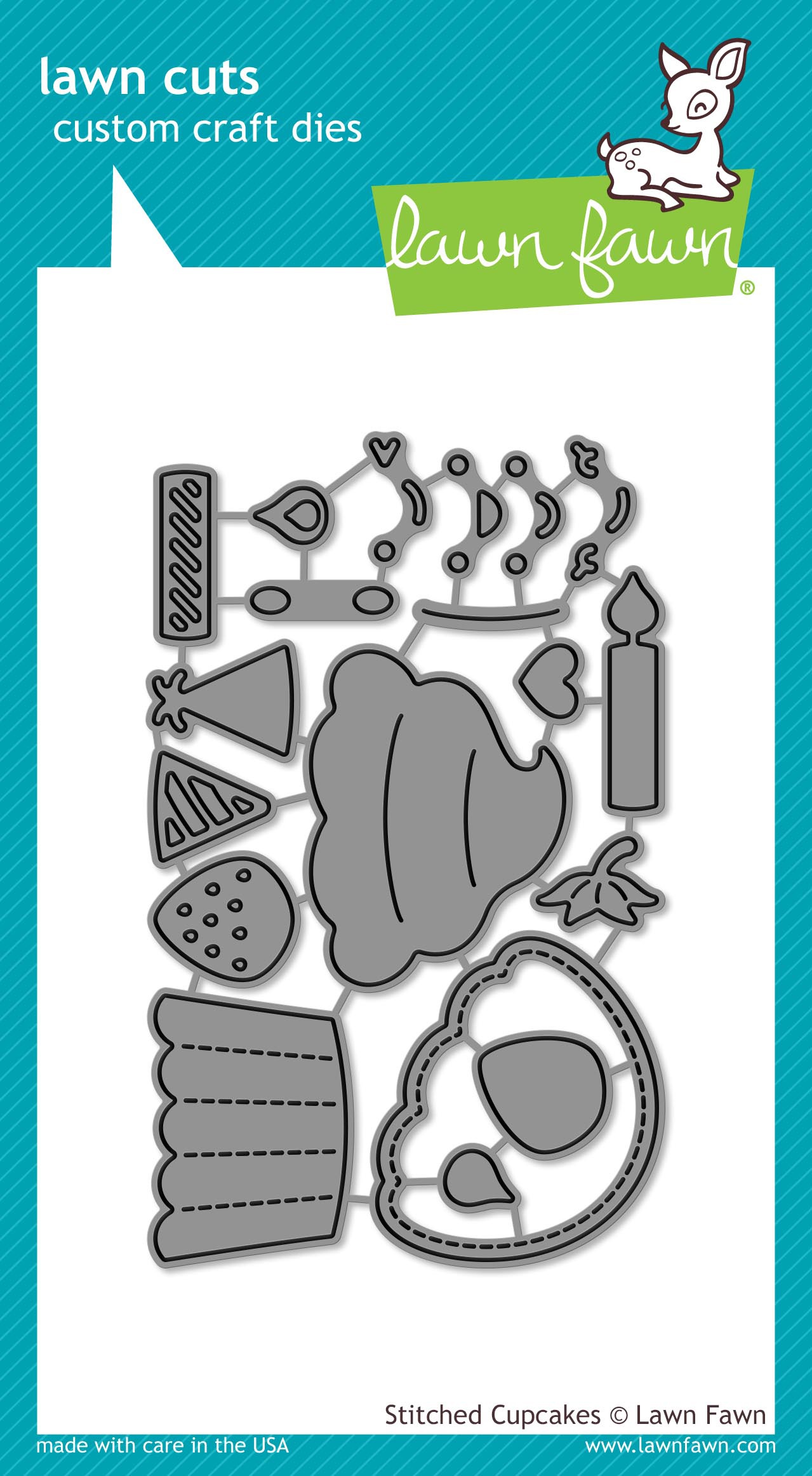 Lawn Fawn custom craft dies are made of 100% high-quality steel, compatible with most die-cutting machines, and will inspire you to create cute crafts! This package contains Stitched Cupcake: 19 dies measuring between .375x.375 inches and 1.75x1.25 inches. WARNING: Choking Hazard- small parts. Not for children under 3 years. Made in USA.