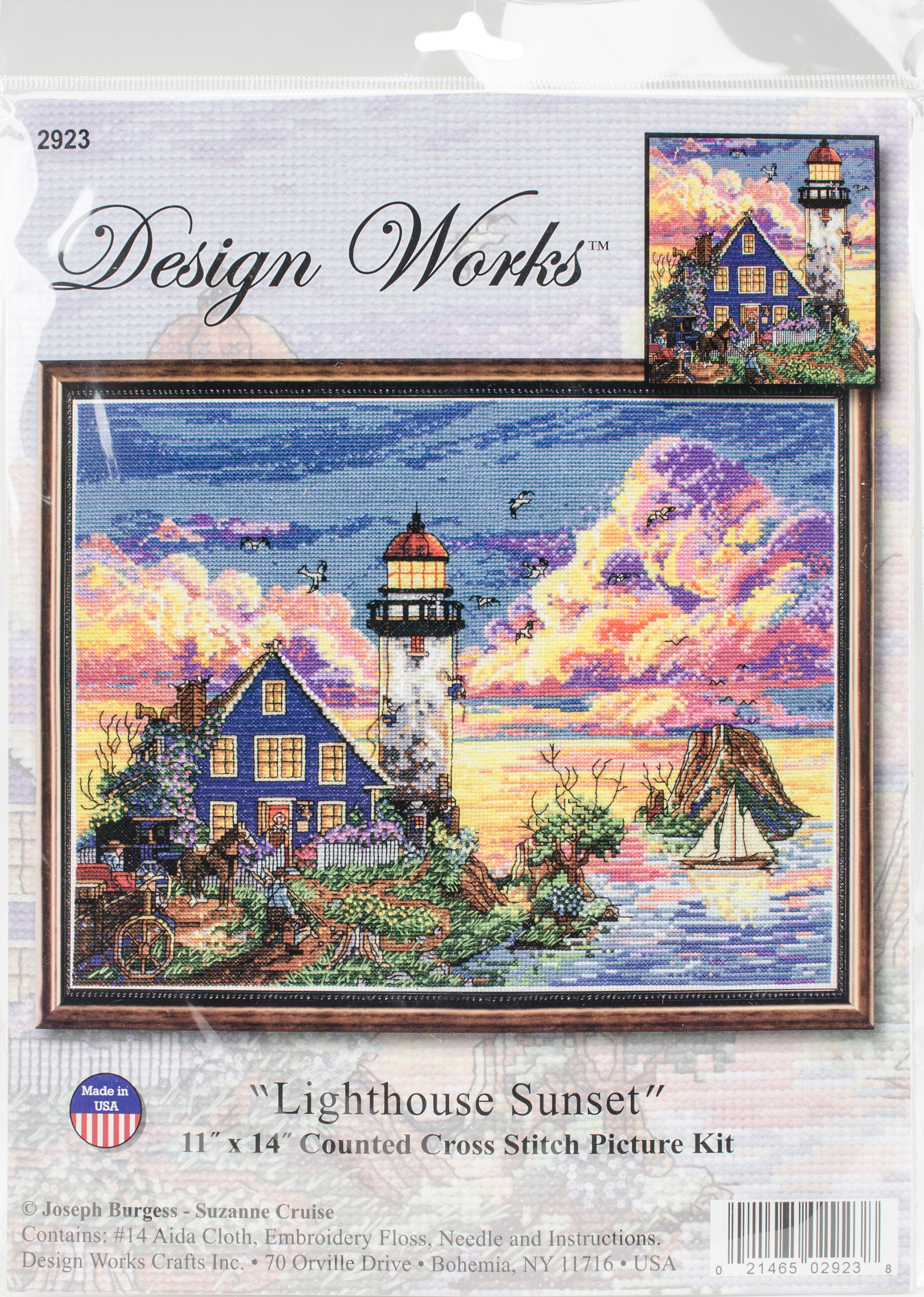 Beautiful designs and top quality materials make Tobin one of the top cross stitch kit makers worldwide. This package contains 14-count white Aida cloth, embroidery floss, one needle and instructions. Design: Lighthouse Sunset. Finished size: 11x14 inches. Made in USA.
