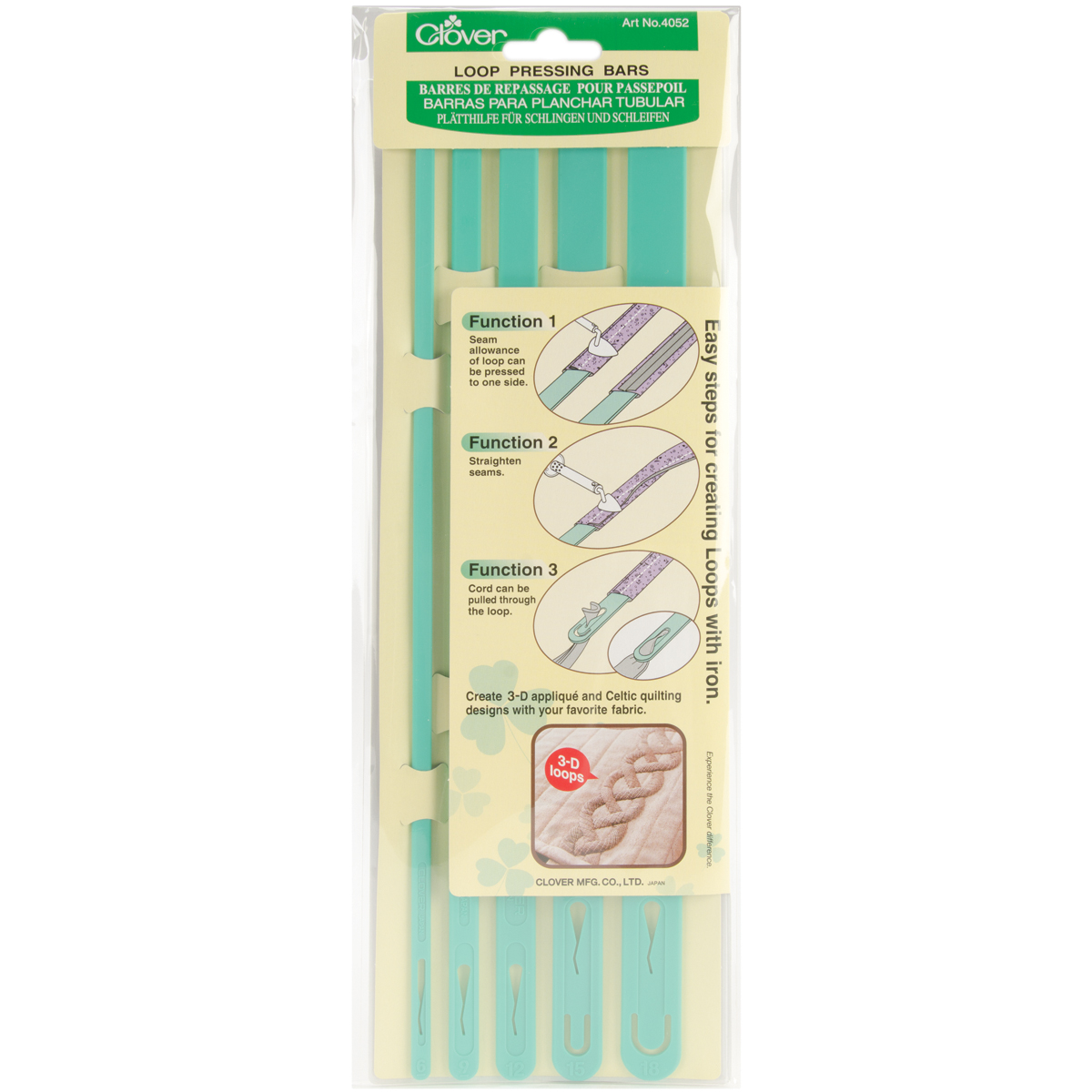 CLOVER-Loop Pressing Bars. These Loop Pressing Bars are an invaluable tool in the sewing room. They can be used to neatly press seam allowances either open or to the side, to straighten seams when pressing, or to pull cords through fabric tubes. This package contains five pressing bars in various widths (1/4- 5/16- 1/2- 9/16- and 11/16 inches). Each one is made of polyamide and measures 12 inches long. Imported.