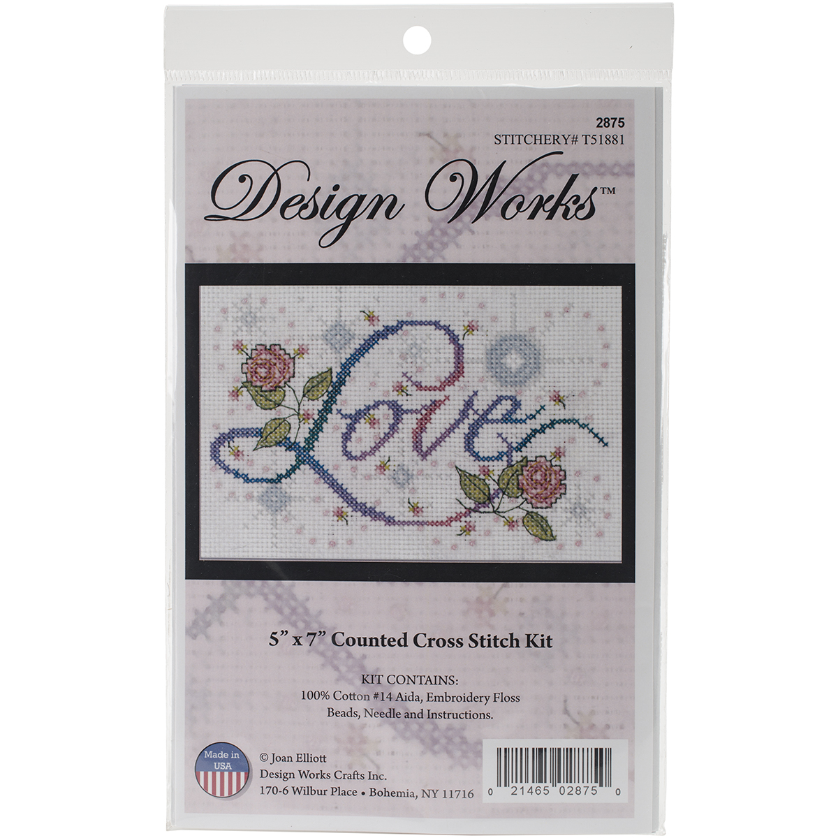 Tobin-Design Works Counted Cross Stitch Kit. Beautiful designs and top quality materials make Tobin one of the top cross stitch kit makers worldwide. This package contains 14-count white Aida cloth, embroidery floss, beads, one needle and instructions. Design: Love. Finished size: 7x5 inches. Made in USA.