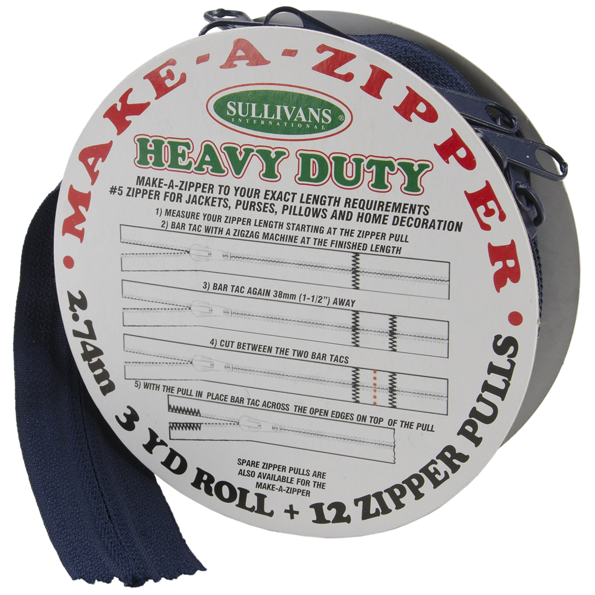 SULLIVANS-Make-A-Zipper Kits can be used to make plastic zippers to your exact length requirements. Designed for heavier fabrics. Includes twelve zipper pulls. Length: 3 yards. Made in China.