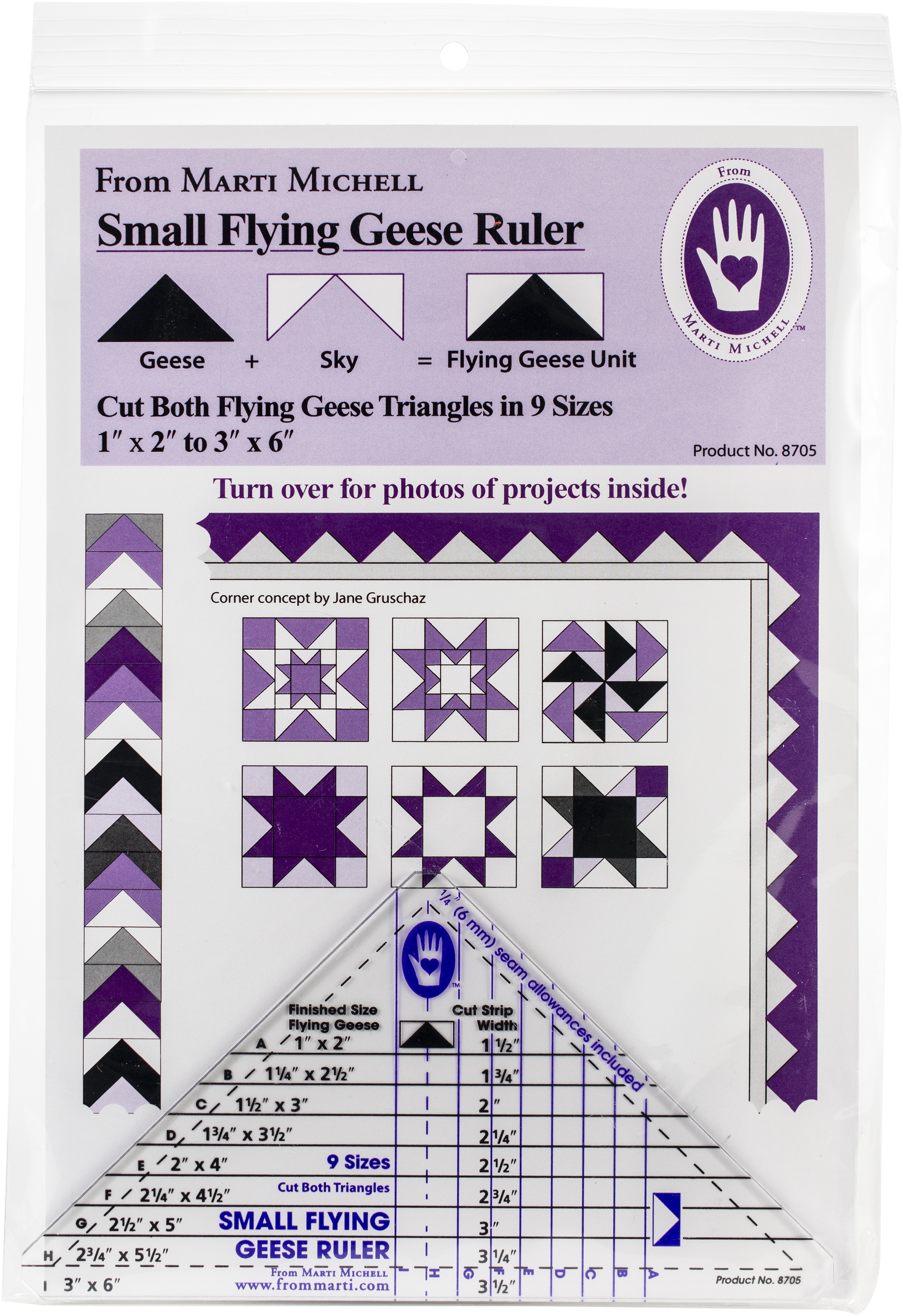 Use this ruler to create beautiful patchwork combinations. This 7x10.75 inch package contains one ruler and instructions. Made in USA.