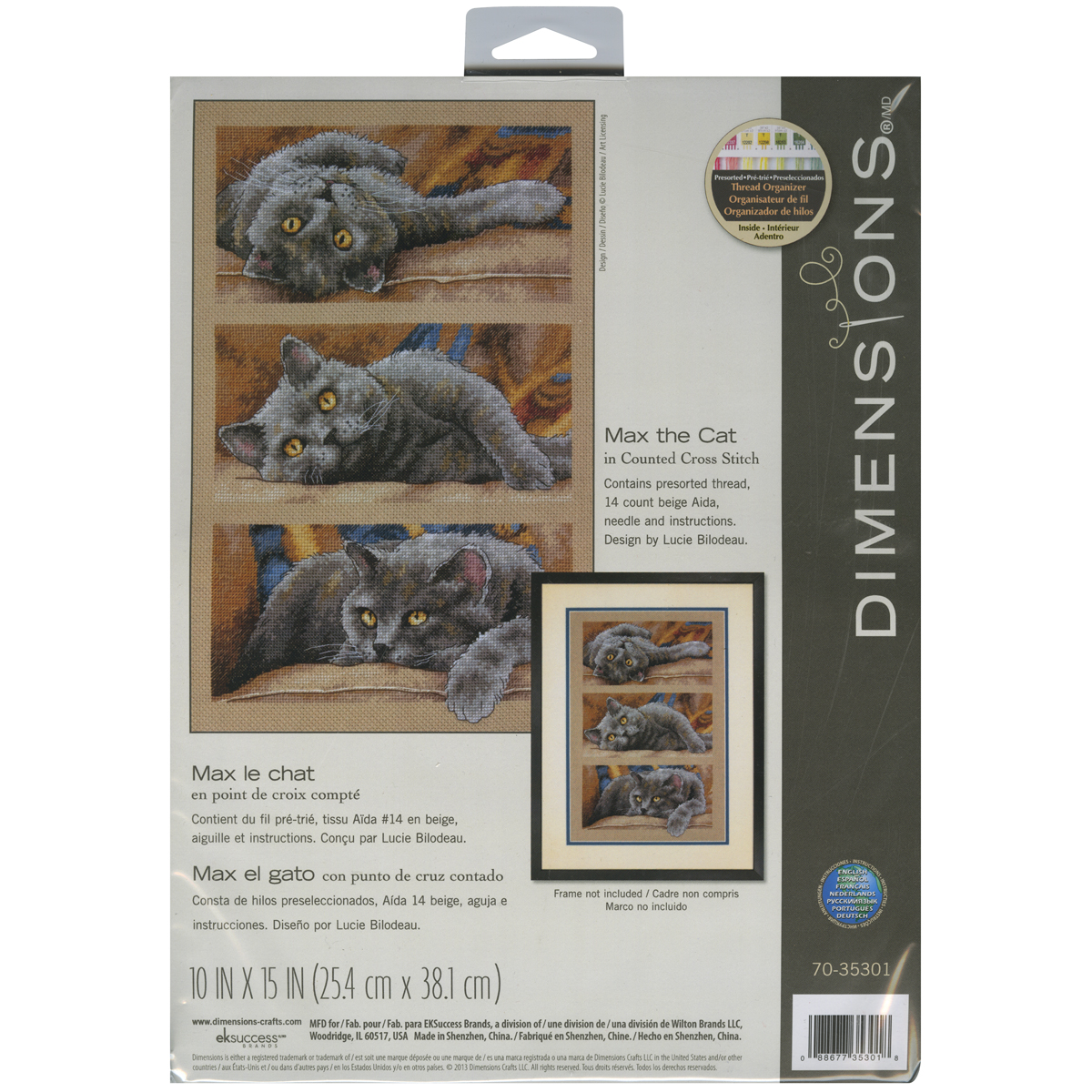 DIMENSIONS-Counted Cross Stitch Kit. Gorgeous designs, vibrant colors, and the highest quality materials are all things that Dimensions brings to you in each of their needlework kits. This kit contains 14-count beige Aida, presorted cotton thread, needle, and instructions. Frame/mat not included. Design: Max The Cat. Finished size: 10x15 inches. Imported.
