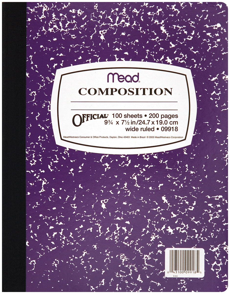 MEAD-Composition Notebook. This package contains one 9-3/4x7-1/2 inch Composition Notebook with 100 sheets of wide ruled paper. Covers come in assorted colors selected at random. Imported.
