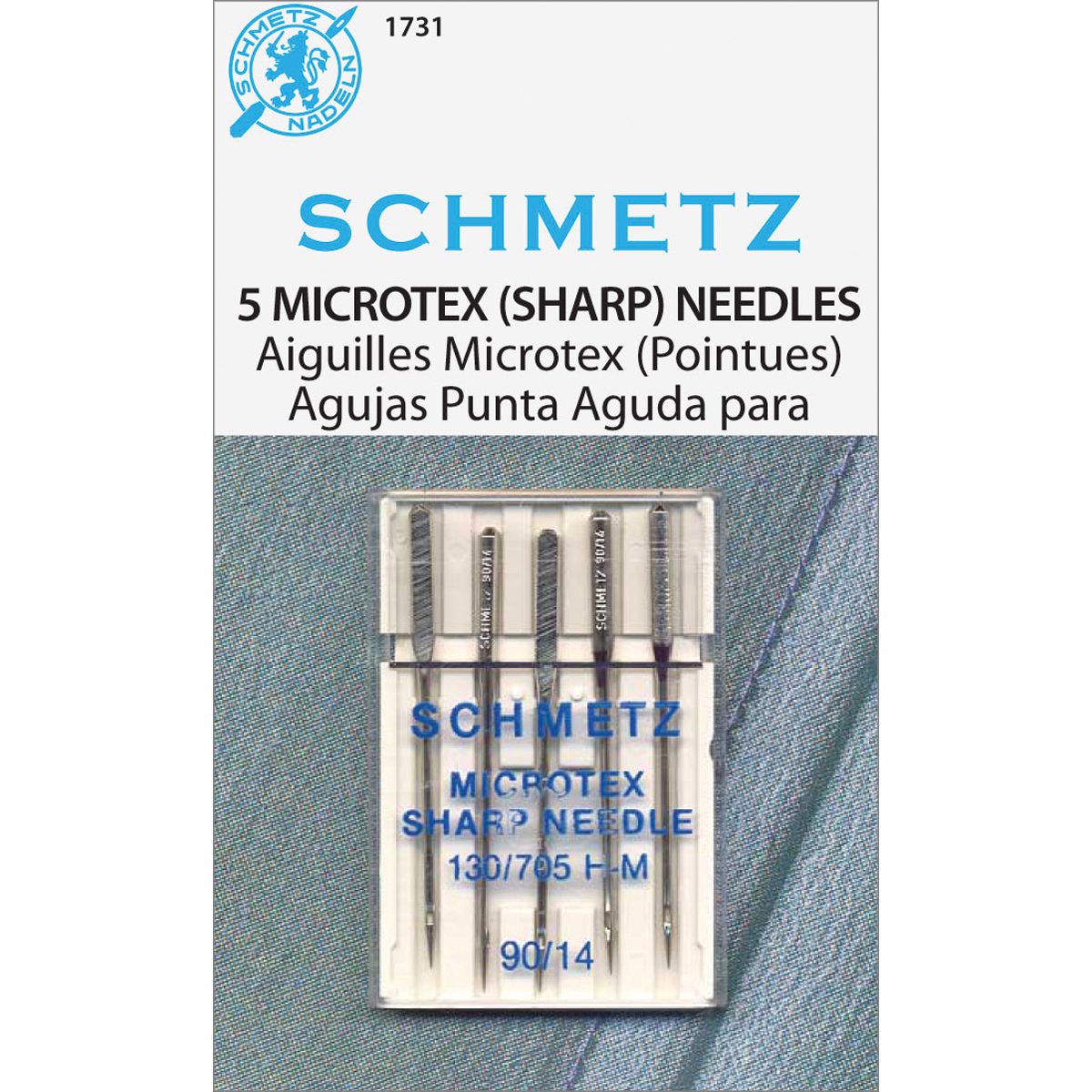 EURO-NOTIONS-Schmetz: Microtex Sharp Needles. These needles work well with micro fibers, polyester, silk, foils, artificial leather, and coated materials. They have very thin acute points that create beautiful topstitching and perfectly straight stitches for quilt piecing. This package contains five 130/705 H-M 90/14 needles. Imported.