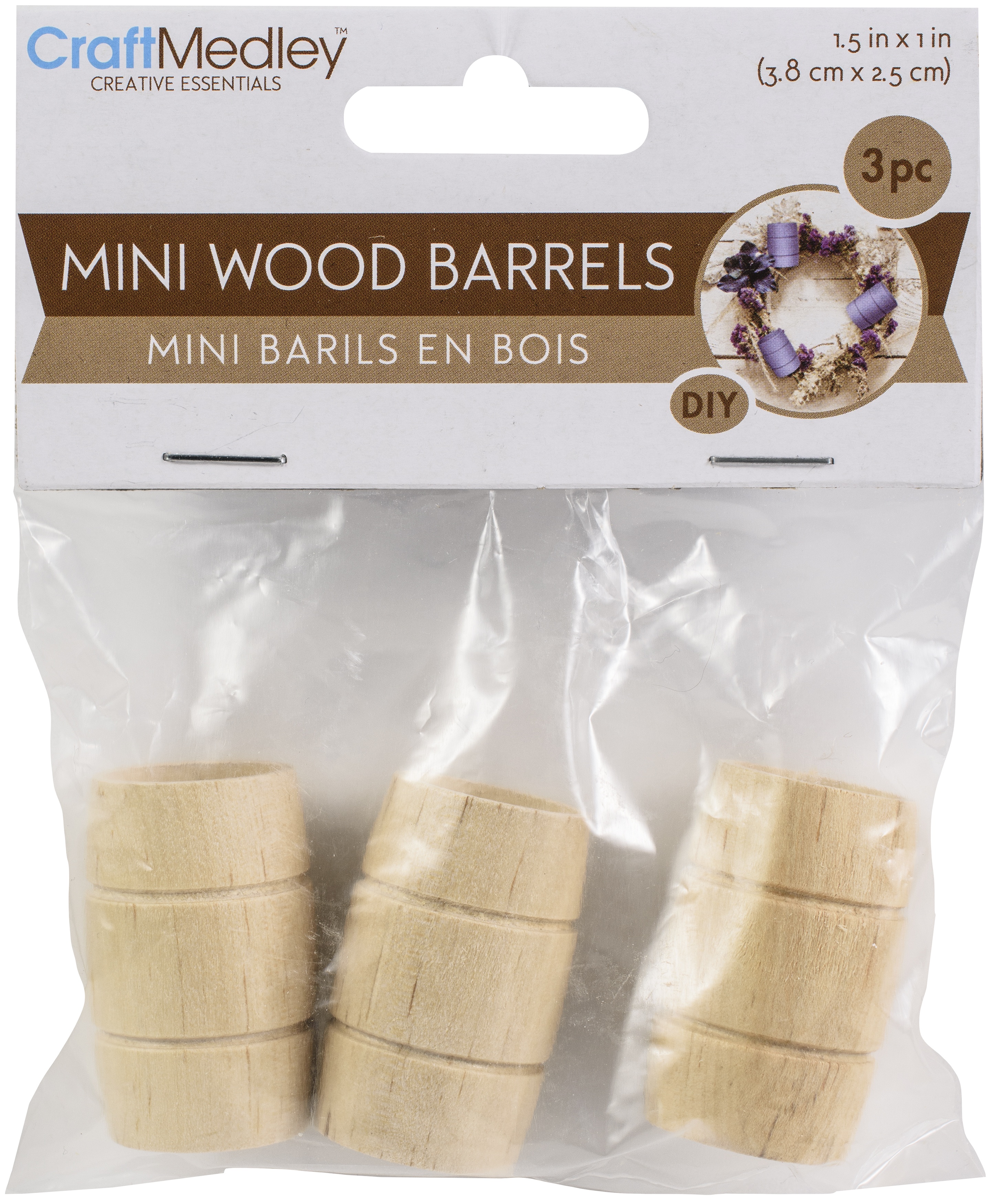 Great for a variety of wood craft projects. Decorate with paints, stains, embellishments and more. This package contains three 1.5x1 inch mini wood barrels. Imported.
