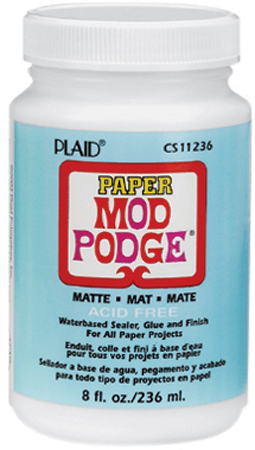 PLAID-An 8 ounce bottle of waterbased sealer, glue, and finish for all paper projects. Non-toxic, non-flammable, acid free, and non-tacky. Comes in a plastic jar with a screw on cap.