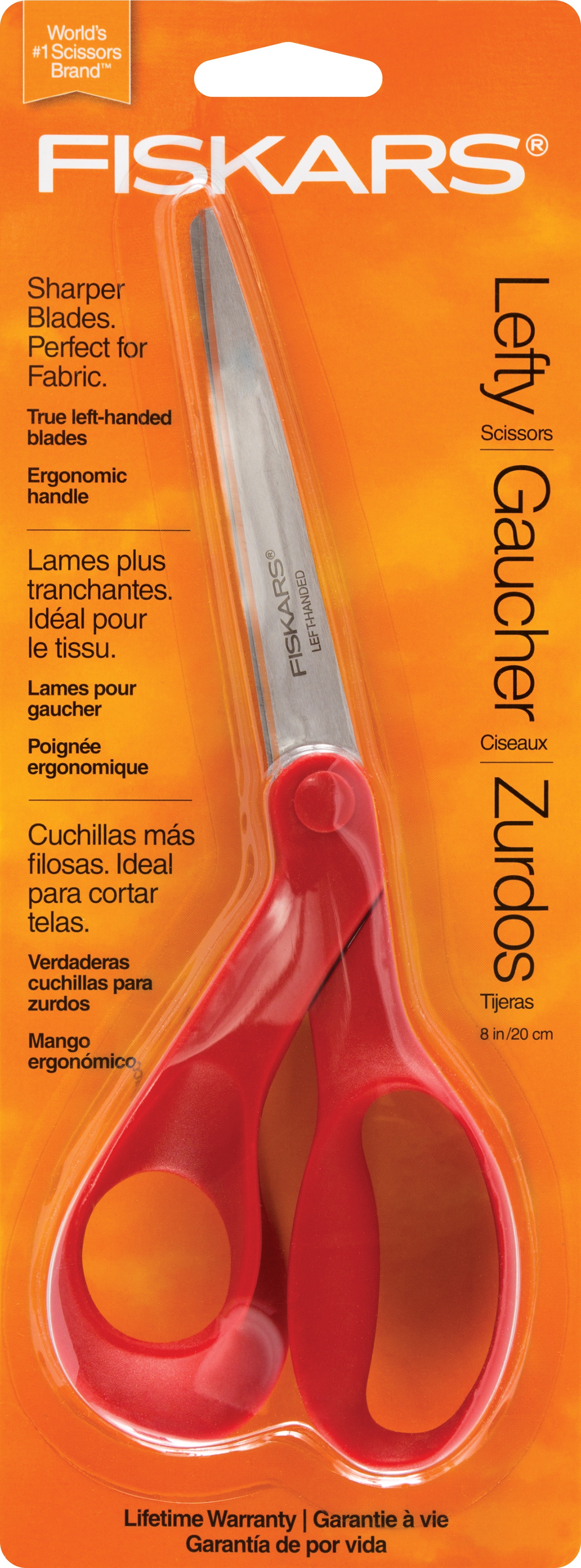 FISKARS-Left Handed Bent 8 inch Multi-Purpose Scissors are perfect for multi-purpose cutting of fabric and many other materials in the home or office. Contoured handles reduce fatigue during extended use. Offset handles make it easy to cut on flat surfaces. Features include: offset handles, multi-purpose cutting, adjustable pivot screw enables blade tension to be modified, and precision ground blades. Color: Red/Orange Handles.