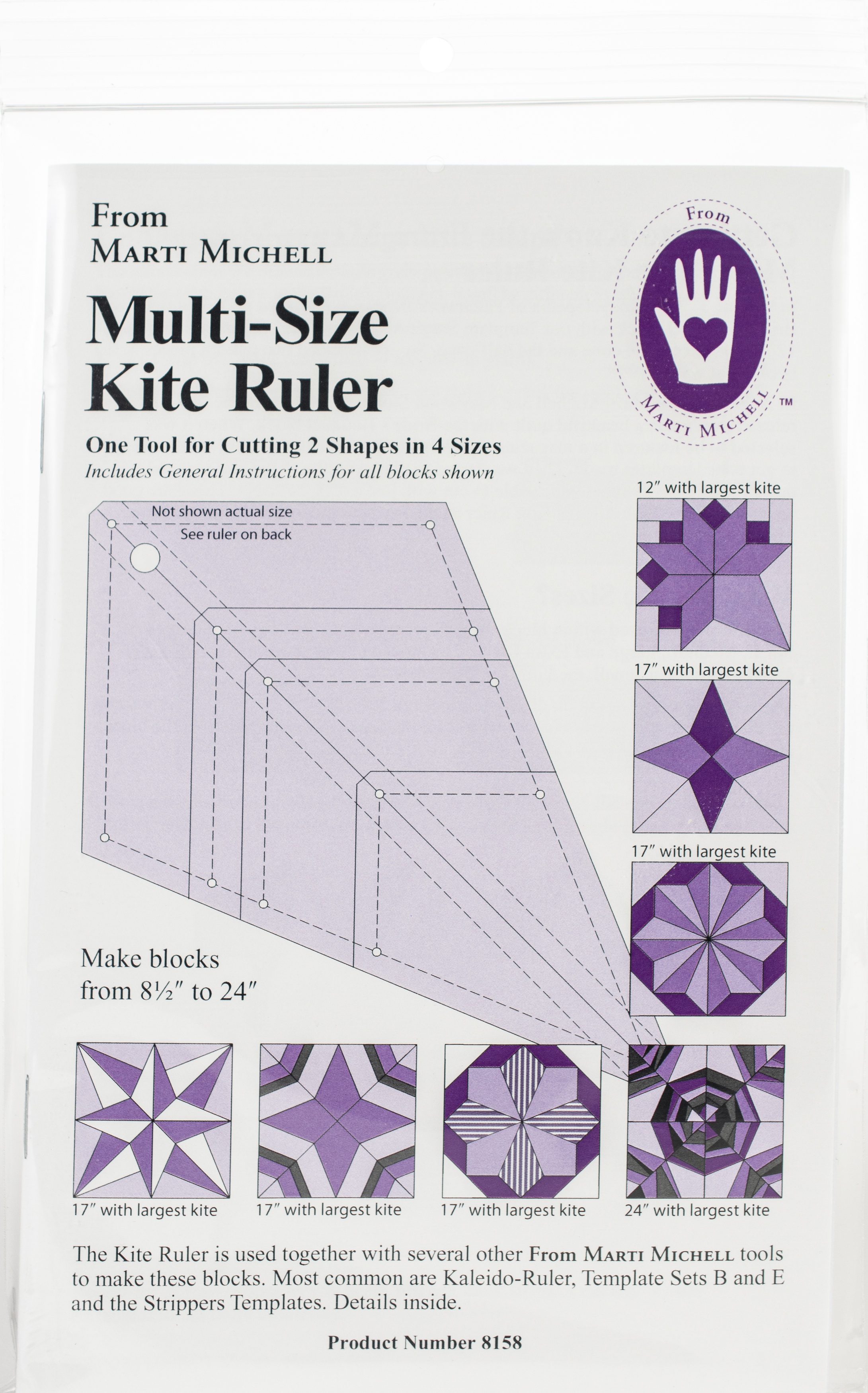 MARTI MICHELL-Perfect Patchwork Templates: Multi-Size Kite Ruler. These templates are perfect for hand or machine piecers. Each laser- cut acrylic template features a perfect 1/4 inch seam allowance so you get specific-size pieces with no guessing! This set includes 1 tool for cutting 2 shapes in 4 sizes. Made in USA.