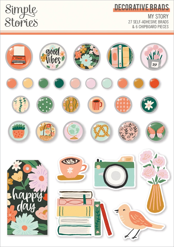 - My Story, 27 Self-adhesive Metal Brads and 6 Chipboard Pieces. Imported.