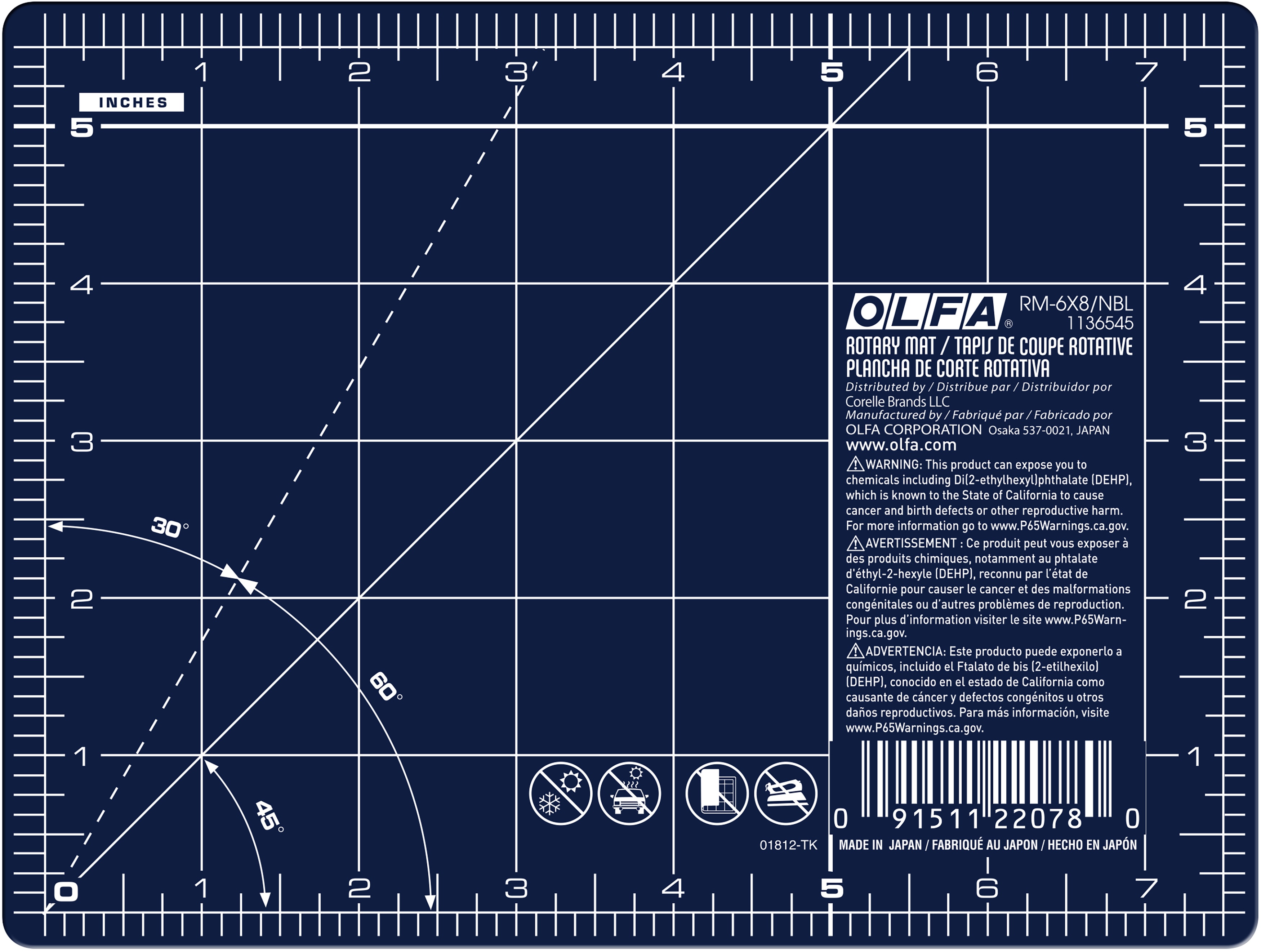 This mat is great for bias strips, cutting squares and triangles or perfectly squaring up blocks. Perfect for small-scale craft projects. This package contains one 6x8 inch self-healing rotary mat. Imported.