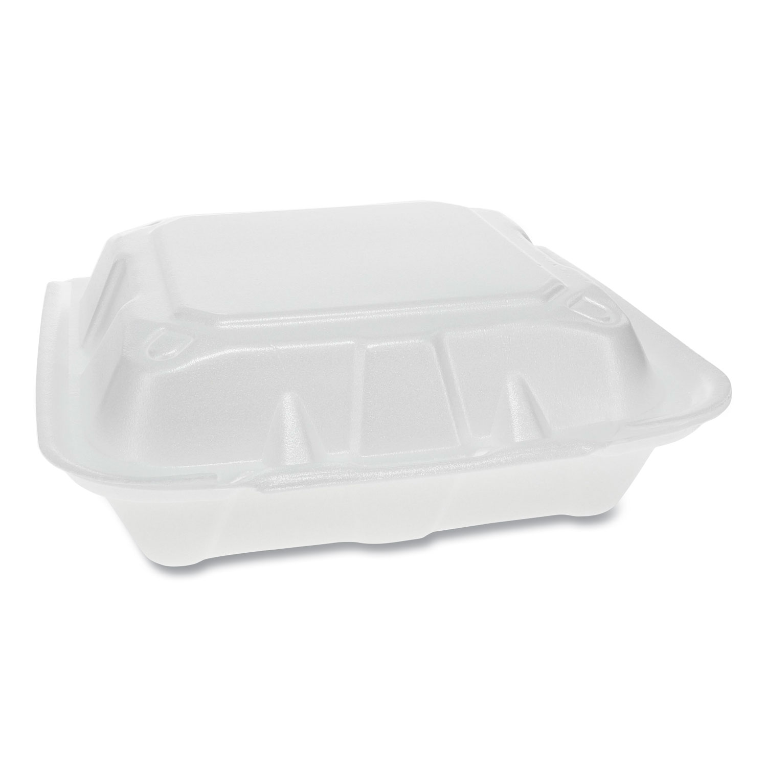 Pactiv Foam Hinged Lid Containers, White, 8.4375 x 8 1/8 x 3, 3-Compartment, 150/Crtn