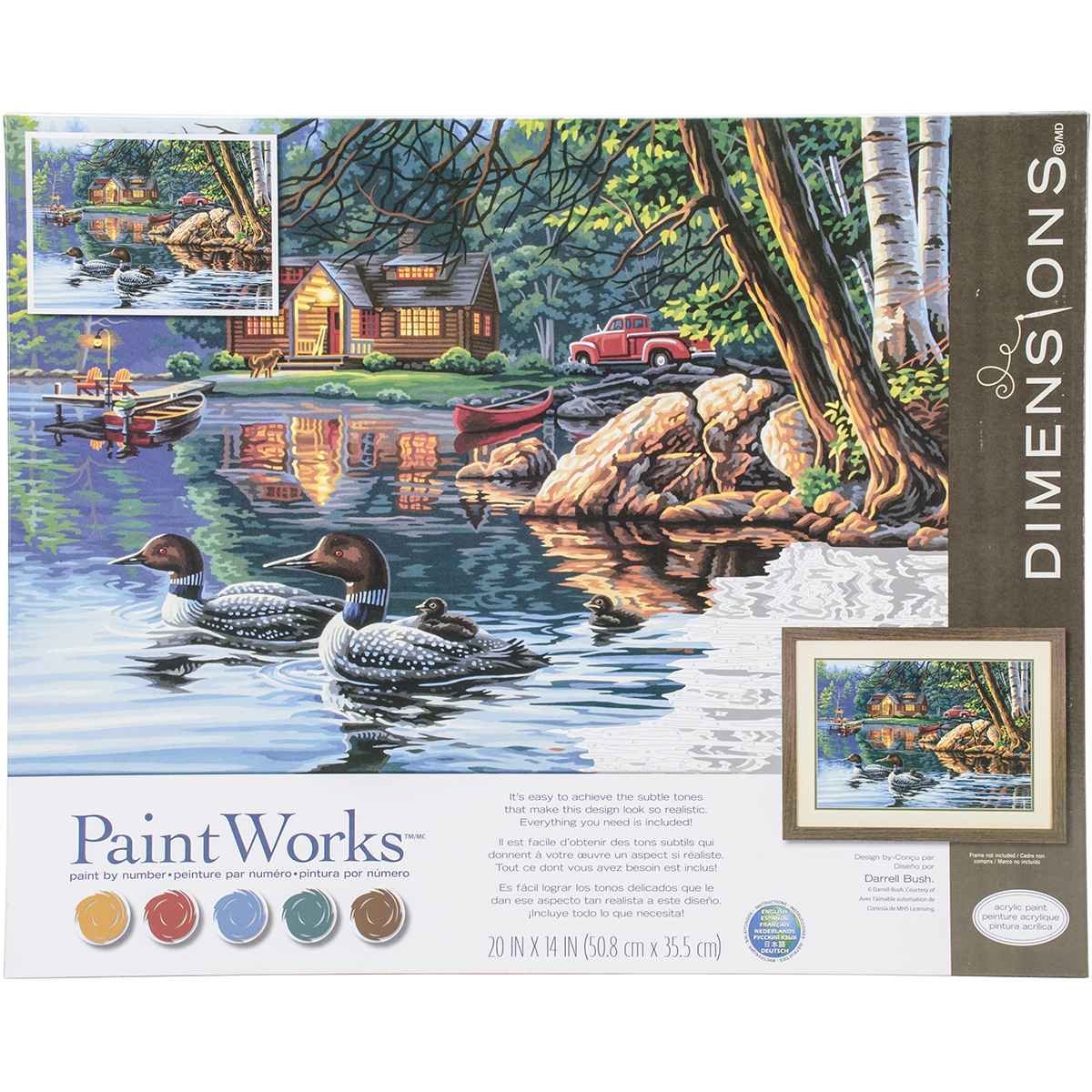Dimensions-Paint Works Paint By Number Kit. Dimensions brings you paint by number kits that are fun and quick. With their color mixing, it is possible to achieve the subtle tones that make their designs look so realistic. Crafters will enjoy the exceptional selection of designs and the great results. This package contains eighteen acrylic paint pots (.16 oz. each), one 14x20 inch printed board, one paintbrush and instructions. Non-toxic. Comes in a variety of designs. Imported.