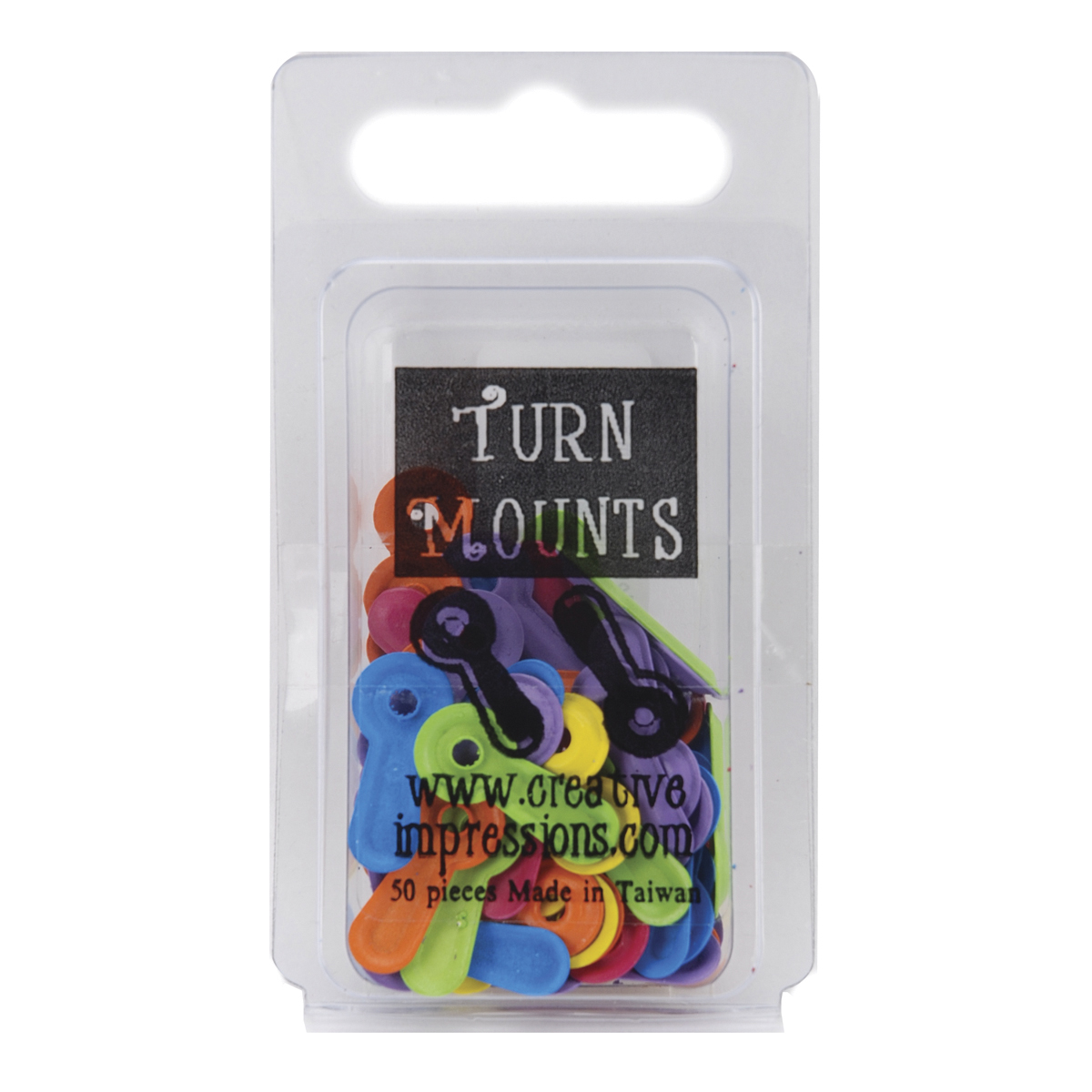 CREATIVE IMPRESSIONS-Large Metal Turn Mounts. These fasteners are perfect for scrapbook layouts, greeting card and all paper craft projects. This package contains fifty 3/4x5/16in Assorted Tropical Matte Painted Turn Mounts in teal, purple, green, yellow and dark pink. Imported.