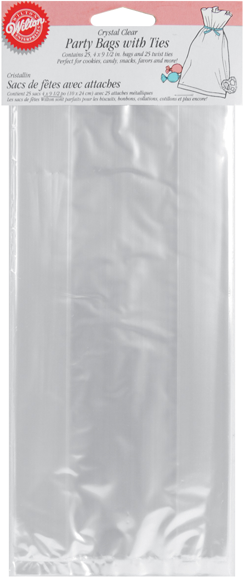 WILTON-Party Bags. Great for any party from birthdays to anniversaries, showers to graduation. This package contains twenty-five clear bags with ties. Measures: 4x9-1/2in. Imported.