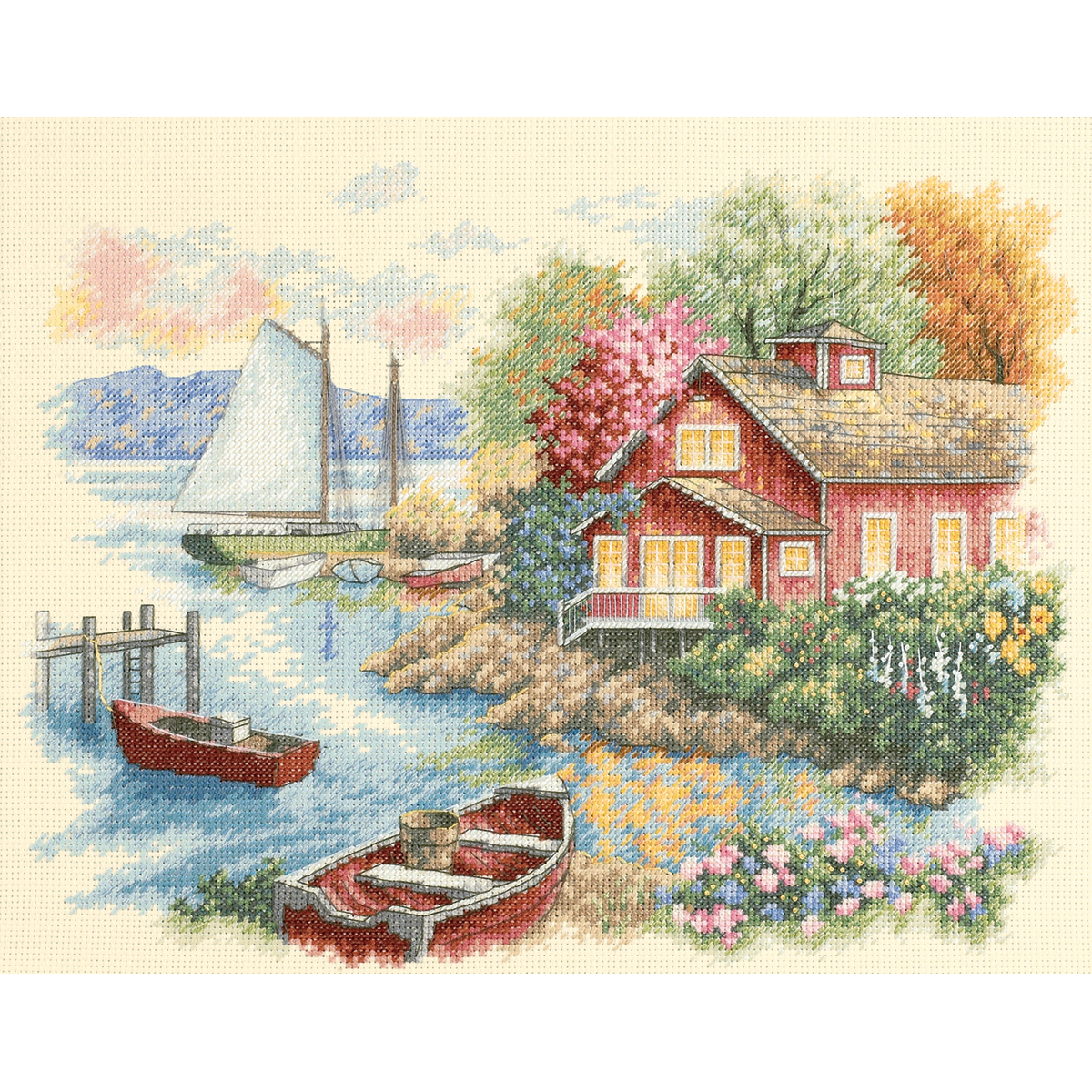 DIMENSIONS-Counted Cross Stitch. Dress up your home with one of Dimensions creative kits. This kit contains 14 count ivory Aida, cotton thread, thread palette, needle and easy to follow instructions. Mat and frame are not included. Finished size: 15x18in. Design: Peaceful Lake House. Designer: Nicky Boehme. Imported.