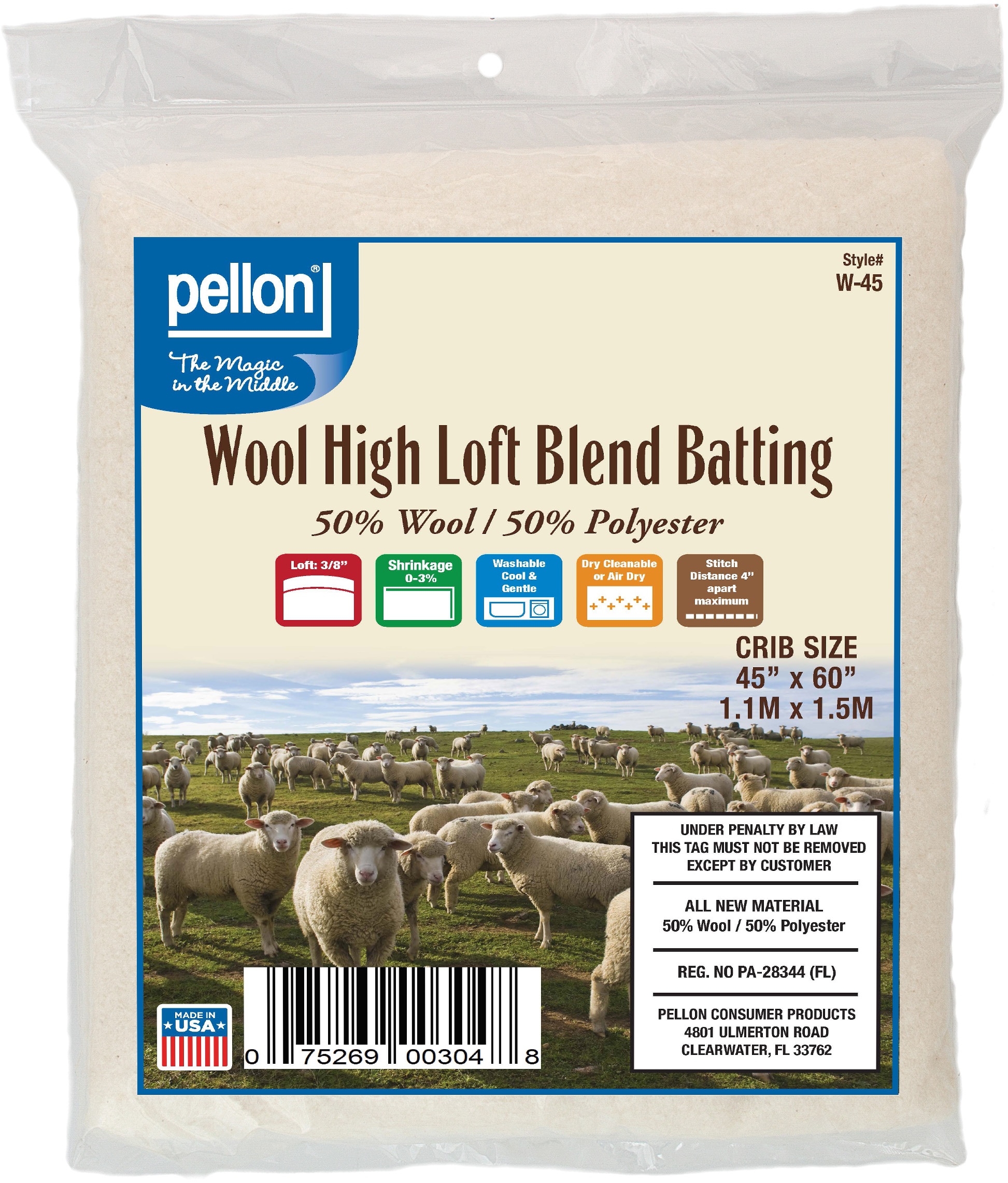 Made with super soft wool that breathes naturally with a high loft. Ideal for hand and machine quilting. Machine quilters who desire very closely stitched areas use wool for its softness and warmth. When using a finer thread, it remains soft and does not result in a stiff quilt. Loft: 1/4 inch. Shrinkage: 0-3%. Stitch Distance: up to 4 inches apart. Fiber Content: 50% Wool / 50% Polyester. Care Instructions: Hand washing / soaking in cold water is recommended. Avoid agitation. Use a gentle detergent recommended for quilts and wool. Lay flat to air dry. This package contains crib size 45x60 inches of wool blend batting. Made in USA