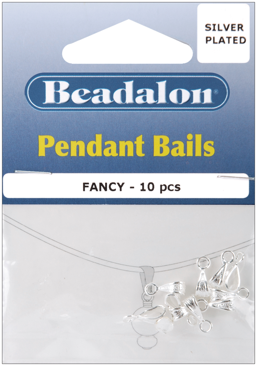 BEADALON-Silver plated pendant bails. Includes 10 per package. Made with base metal. Clip-on bails make it easy to add a bead or pendant to chain or cord necklaces. Size: approximately 3/8. Not a toy.
