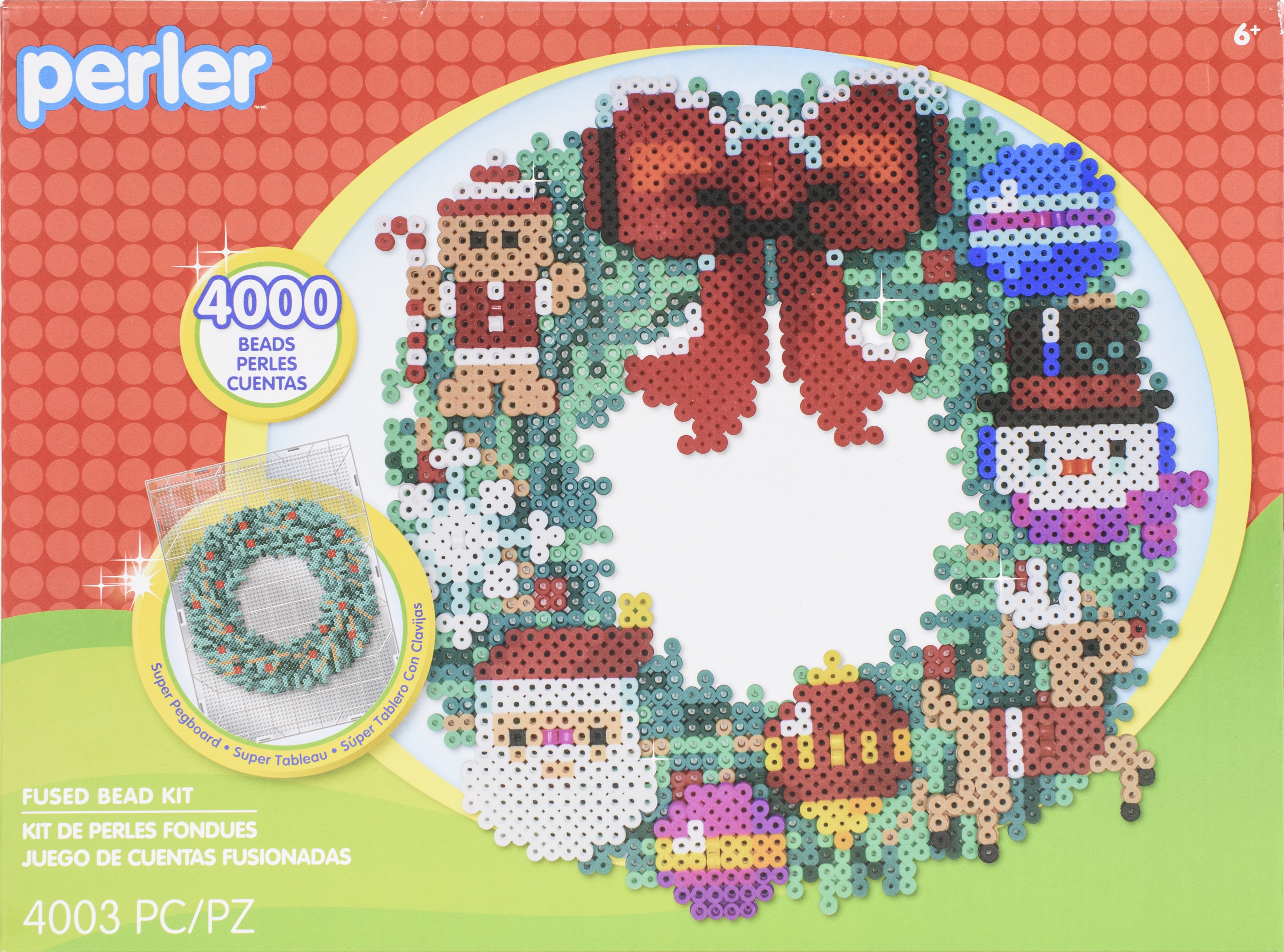 Make a festive wreath to display on a door or wall this Christmas season with this activity kit by Perler. Classic holiday and winter icons easily attach to the wreath base for a dimensional effect. Kit contains 4000 beads, 1 super pegboard, pattern sheet with instructions, and ironing paper.