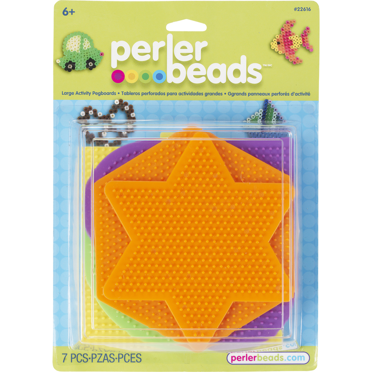 PERLER-Funfusion Activity Pegboards. Perler bead activities are a great way to teach kids counting and colors. Just design, fuse, and play! This package contains five large plastic pegboards: Star (5x 5-3/4in), Heart (6x6-1/2in), Hexagon (5-1/2x6-1/2), Circle (6x6in), Square (5-1/2x5-1/2), plus a re-usable ironing sheet, and instructions. Perler beads not included. Color of pegboards may vary. Recommended for ages five and up. Made in USA.