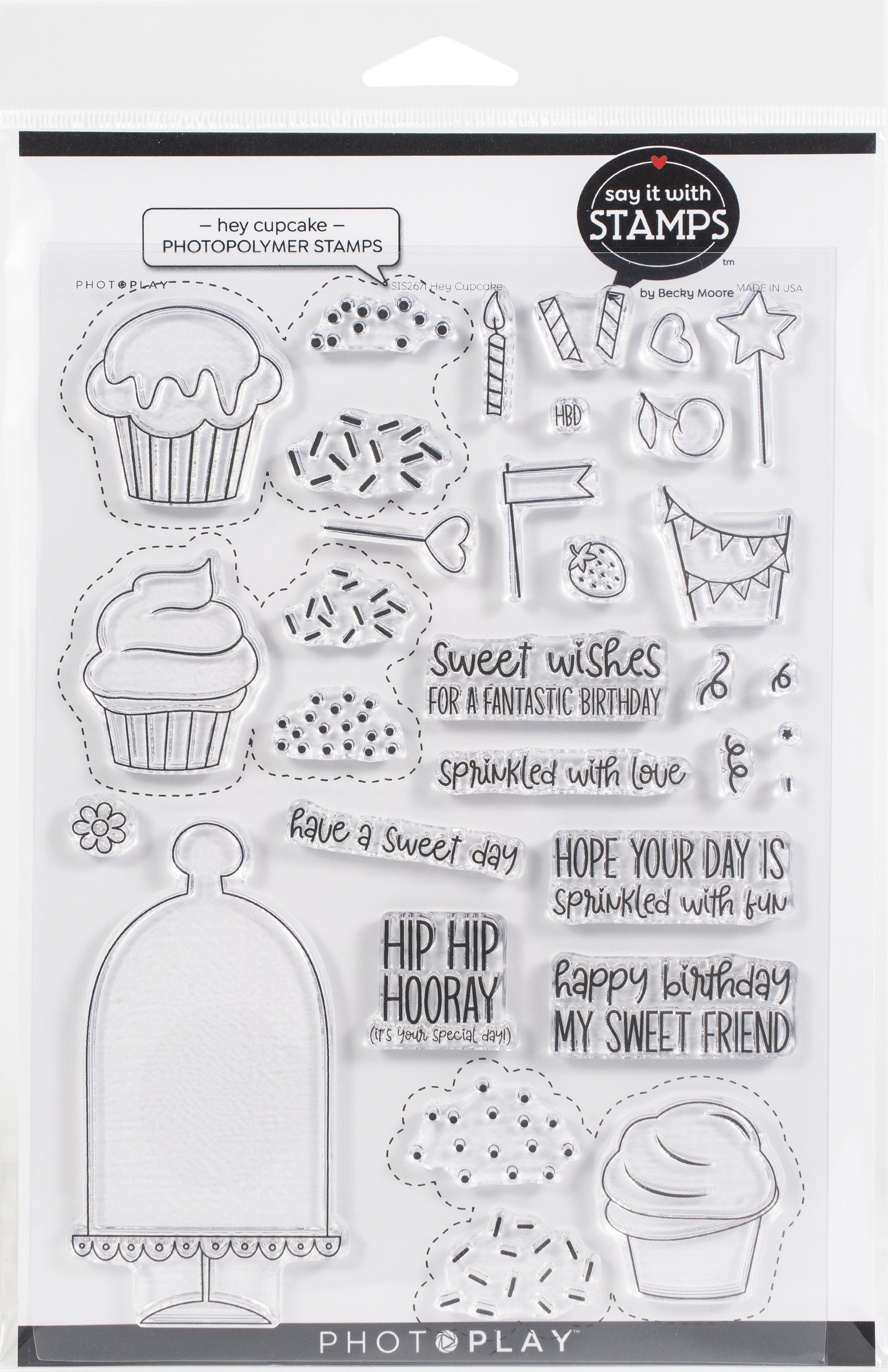 Add thoughtful phrases and charming images to greeting cards, scrapbook pages, mixed media and more with PhotoPlay Polymer Clear Stamps. Easily attach stamps to a clear acrylic stamp block and stamp away! Package contains Hey Cupcake
