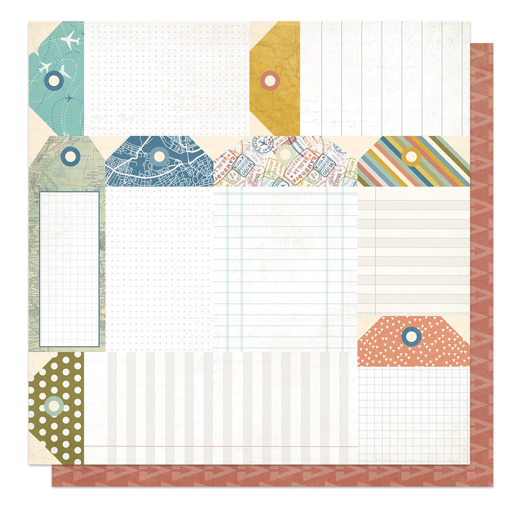 Wanderlust has gone contemporary vintage and our new Travelogue collection will not disappoint! The muted color palette blends perfectly with indoor and outdoor photos, making your travel memories the star of the show. This package contains one 12x12 inch double-sided cardstock sheet, 65#. Acid free. Lignin free. Made in USA.