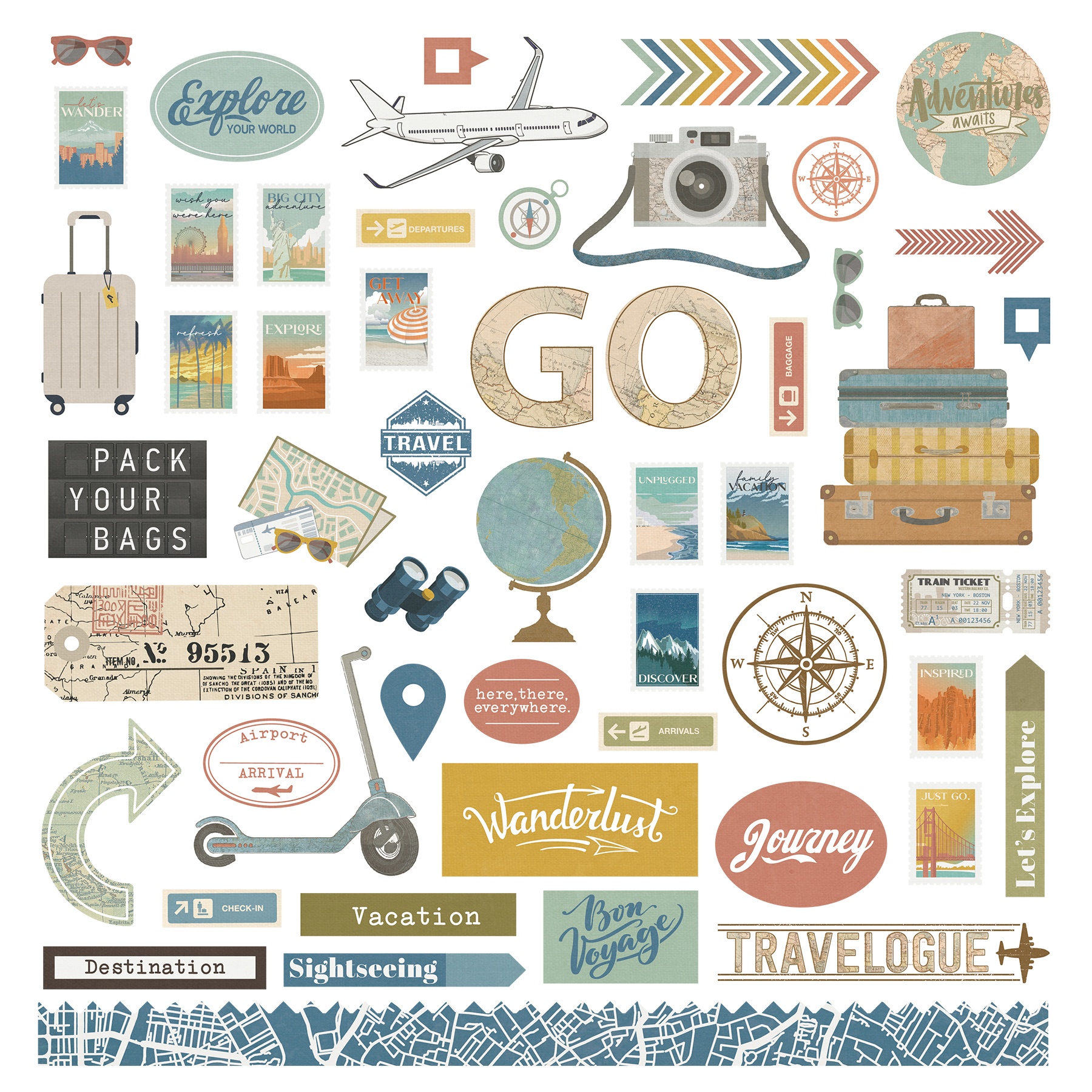 Wanderlust has gone contemporary vintage and our new Travelogue collection will not disappoint! The muted color palette blends perfectly with indoor and outdoor photos, making your travel memories the star of the show. This package contains one 12x12 inch sticker sheet. Acid free. Lignin free. Made in USA.