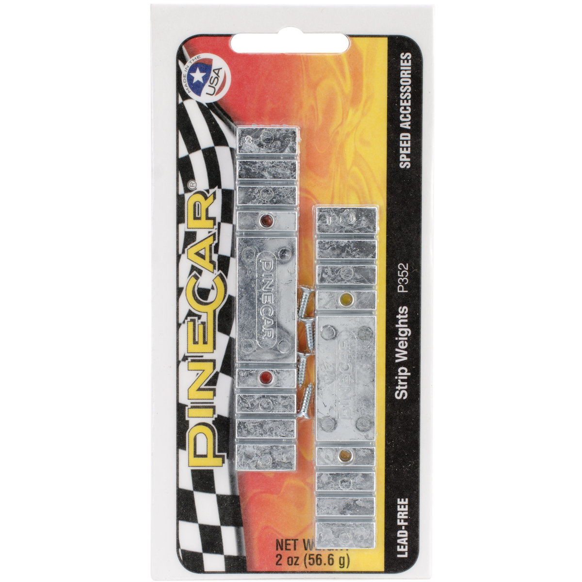 PINEPRO-Pine Car Derby Weights: Strip. A great way to add extra weight to your car to speed it up during a race. This package contains 2 oz of strip weights and four screws. WARNING: Choking Hazard. Small parts. Not intended for children under 3 years. Adult supervision required. Made in USA.