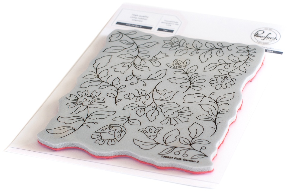 1 piece cling stamp designed by Inna Moreva. Made to coordinate with the Folk Garden 2 layering stencil set and the Folk Garden 2 die. Available for purchase separately. Whimsical & folksy, this leafy floral background is a perfect background for A2 sized cards. The blooms and leaves are perfect for all types of coloring; including watercolor, alcohol & brush markers, colored pencils and no-line coloring. Use the coordinating Folk Garden 2 die to cut out all the elements and pop up with foam adhesive for added dimension, or use each element separately. Get a perfect stamp impression every time with our high quality background stamps. They are made from deeply etched red rubber mounted to cling foam and made in the USA. Folk Garden measures approximately 4.25 x 5.5 inches.