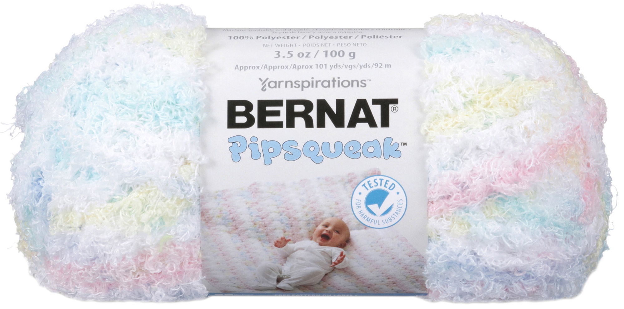 Bernat Pipsqueak Yarn. A soft chunky weight yarn that knits and crochets up quickly. Ideal for kids and babies. Weight category: 5. Content: 100% polyester. Putup: 3.5oz/100g, approximately 120yd/109m. Gauge: knit: 11st x16r = 4in/10cm on size US9/5.5mm needles, crochet: 9sc x 12r = 4in/10cm on size I9/5.5mm hook. Dyelotted: we try but are not always able to match dye lots. Care: machine and dry, do not bleach, do not iron, dry cleanable.