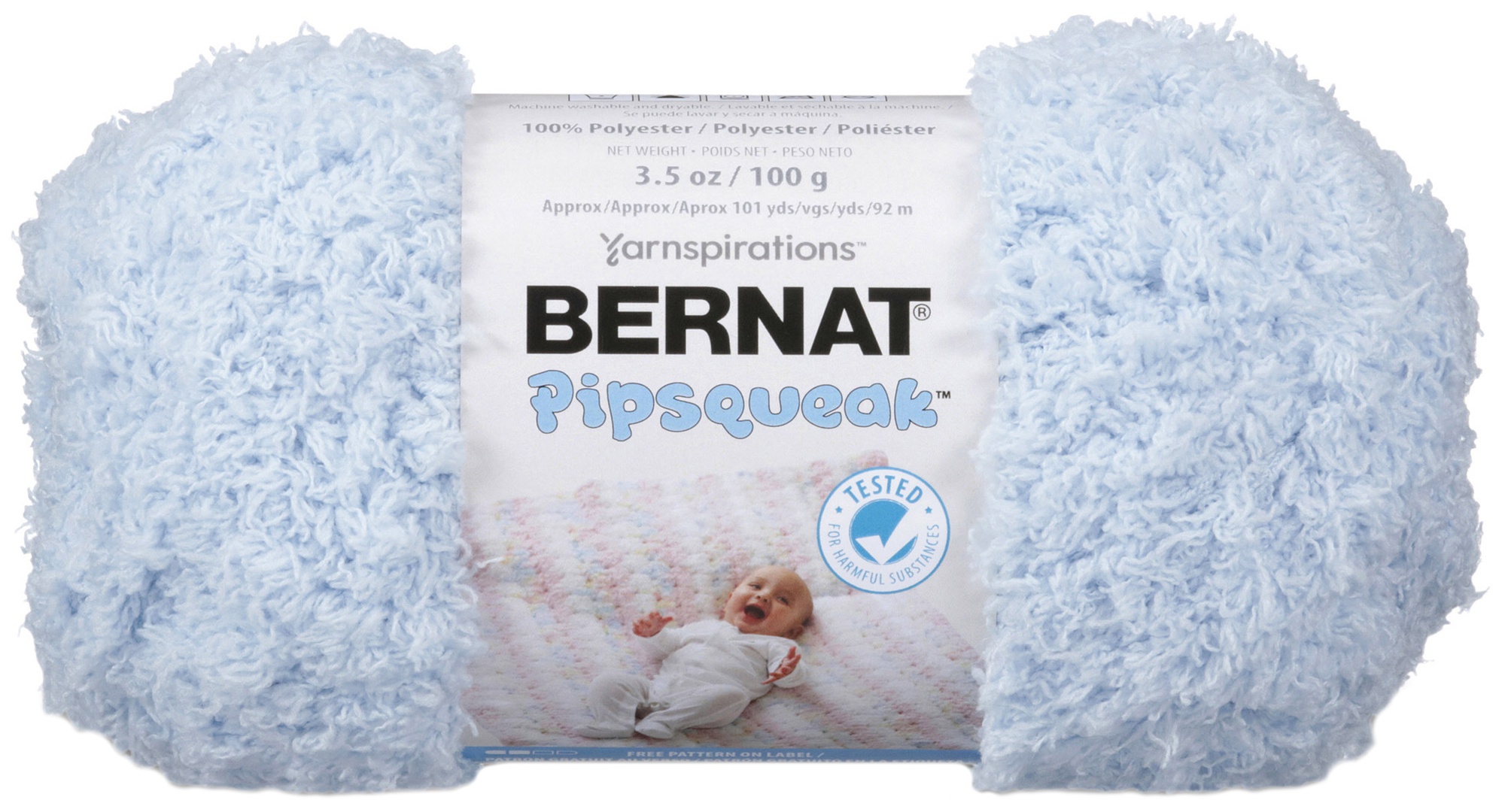 Bernat Pipsqueak Yarn. A soft chunky weight yarn that knits and crochets up quickly. Ideal for kids and babies. Weight category: 5. Content: 100% polyester. Putup: 3.5oz/100g, approximately 120yd/109m. Gauge: knit: 11st x16r = 4in/10cm on size US9/5.5mm needles, crochet: 9sc x 12r = 4in/10cm on size I9/5.5mm hook. Dyelotted: we try but are not always able to match dye lots. Care: machine and dry, do not bleach, do not iron, dry cleanable.