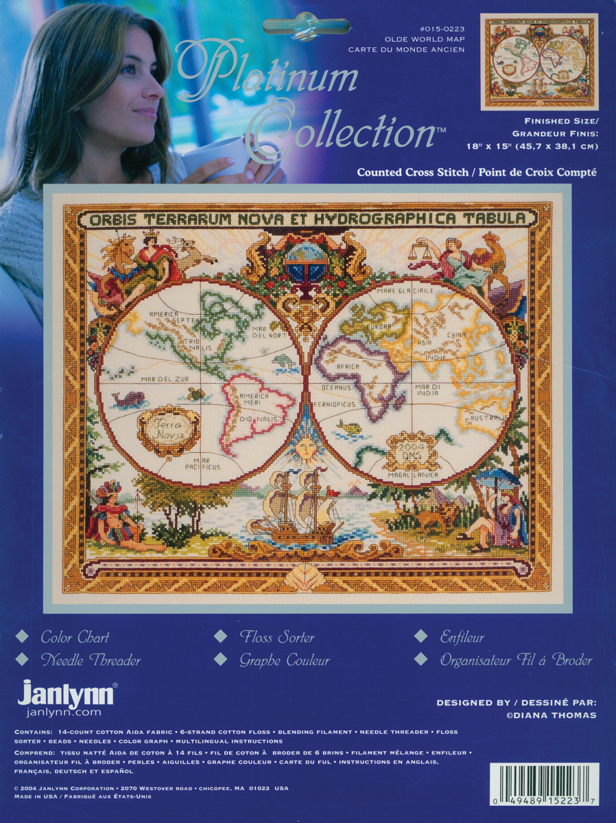 JANLYNN-Olde World Map. Counted Cross Stitch. Chart a course around the world as sailors of long ago! Magnificent olde world map for an office or family room wall. With its charts and imagery of times past, it is sure to capture the fancy of all who love history. From inside a dazzling beaded border, one can dream of sailing into sunrises to new adventures. Kit contains: 14-count Antique White cotton Aida fabric, 6-strand cotton floss, beads, floss sorter, needles, needle threader, graph and multi-lingual instructions. Design size: 18x15 inches. (mat/frame not included).