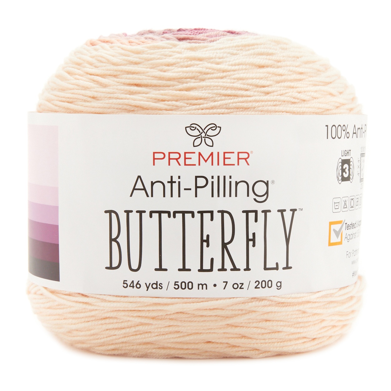 Butterfly(TM) features a unique stripe pattern with two-thirds of theball one solid color and the remaining third features a five-colorstripe. Each ball stops and starts at the same point of the stripepattern, taking away the frustration of finding the right spot in thestripe pattern. It has passed the highest standard, suitable fordirect contact with the most sensitive skin, even babies and smallchildren. Weight Category: 3. Content: 100% Anti-Pilling Acrylic. Putup: 7oz/200g, 546yd/500m. Gauge: 22stsx28r=4in/10cm on size US 6/4mmknitting needles. Suggested crochet hook size: US G6/4mm. Dyelotted:we try but are not always able to match dyelots. Machine Wash Warm,Do Not Bleach, Tumble Dry Normal, Do Not Iron, Do Not Dry Clean.Imported.