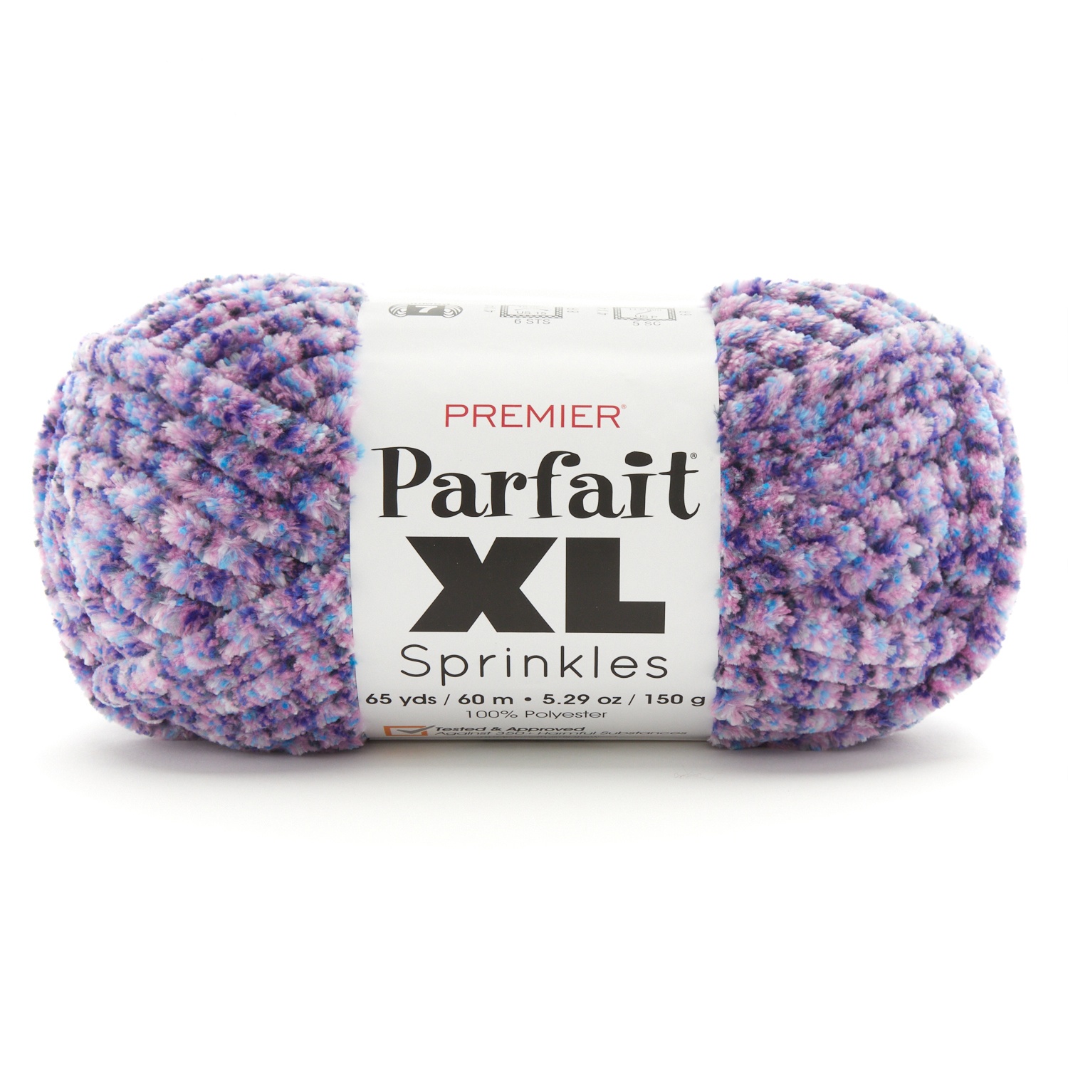 Everything you love about Parfait Chunky, our tried and true 100% polyester chenille yarn, in a jumbo weight! Parfait XL Sprinkles features a colorful, sprinkle print in fun color combinations, perfect for all kinds of home decor projects and more! Machine washable, and incredibly soft, youll find this yarn irresistible. Weight Category: 7. Content: 100% Polyester. Put up: 5.29oz/150g, 65yd/60m. Gauge: 6sx8r=4in/10cm on size US 15/10mm knitting needles. Suggested crochet hook size: US P/11.5mm. Dyelotted: we try but are not always able to match dyelots. Machine Wash Warm, Do Not Bleach, Dry Flat, Do Not Iron, Dry Clean with Solvents. Imported.