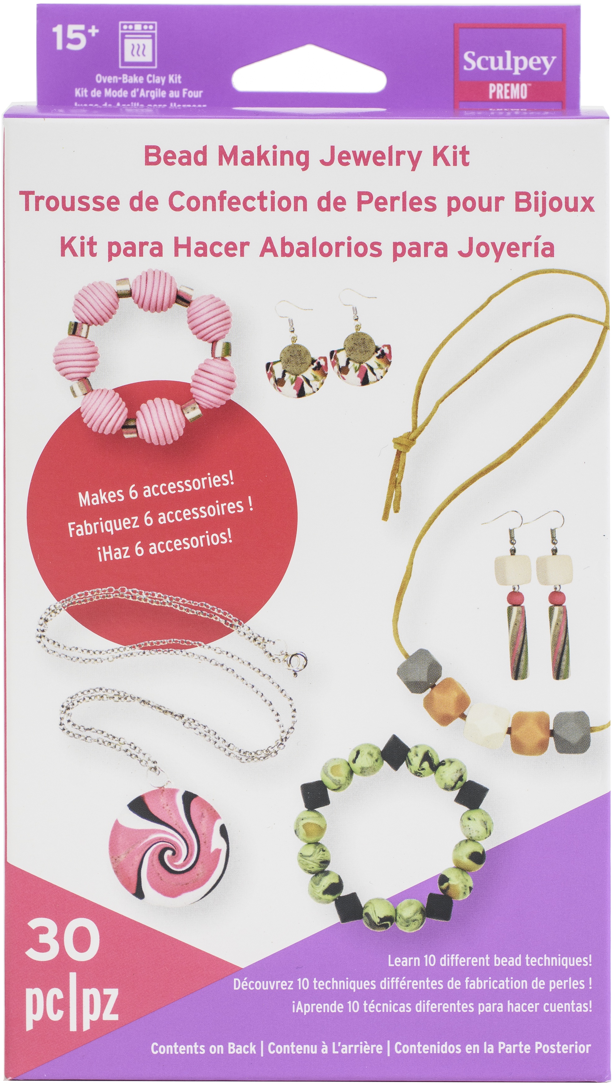 Learn ten different bead techniques! Makes six accessories. This 4.25x6.75x1.75 inch package contains 6oz of clay, instructions, clay roller, needle tool, small blade, circle cutter, lentil bead tool, clay baking cushion, necklace chain, faux suede cord, head pin, jump ring, four fish hook earrings, eight eye pins and two elastic cords. Conforms to ASTM D 4236. Made in USA.