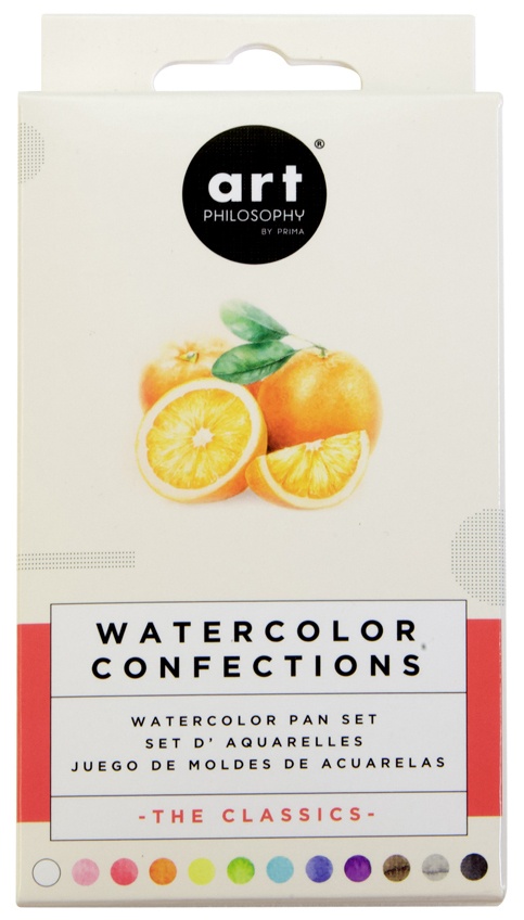 Prima Marketing-Watercolor Confections Watercolor Pans: The Classics. These artist grade, high quality and highly pigmented watercolor pans are sized perfectly for artists on the go. The professional grade paints provide bright, intense, smooth and long lasting colors that work beautifully for any art or mixed media project. This 3x5x1 inch package contains twelve watercolor pans within one metal palette tin with two fold-out mixing areas. Imported.