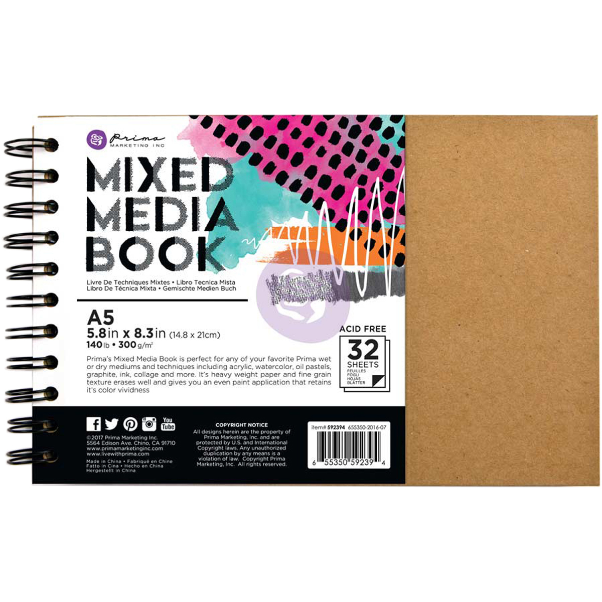 Prima Marketing-Mixed Media A5 Spiral Bound Kraft Book. Use for watercoloring, sketching, and more. These sturdy pages can handle mixed media techniques, mediums and more. This package contains one 9x6 inch spiral bound book with thirty-two 8.3x5.8 inch sheets. Acid free. Imported.