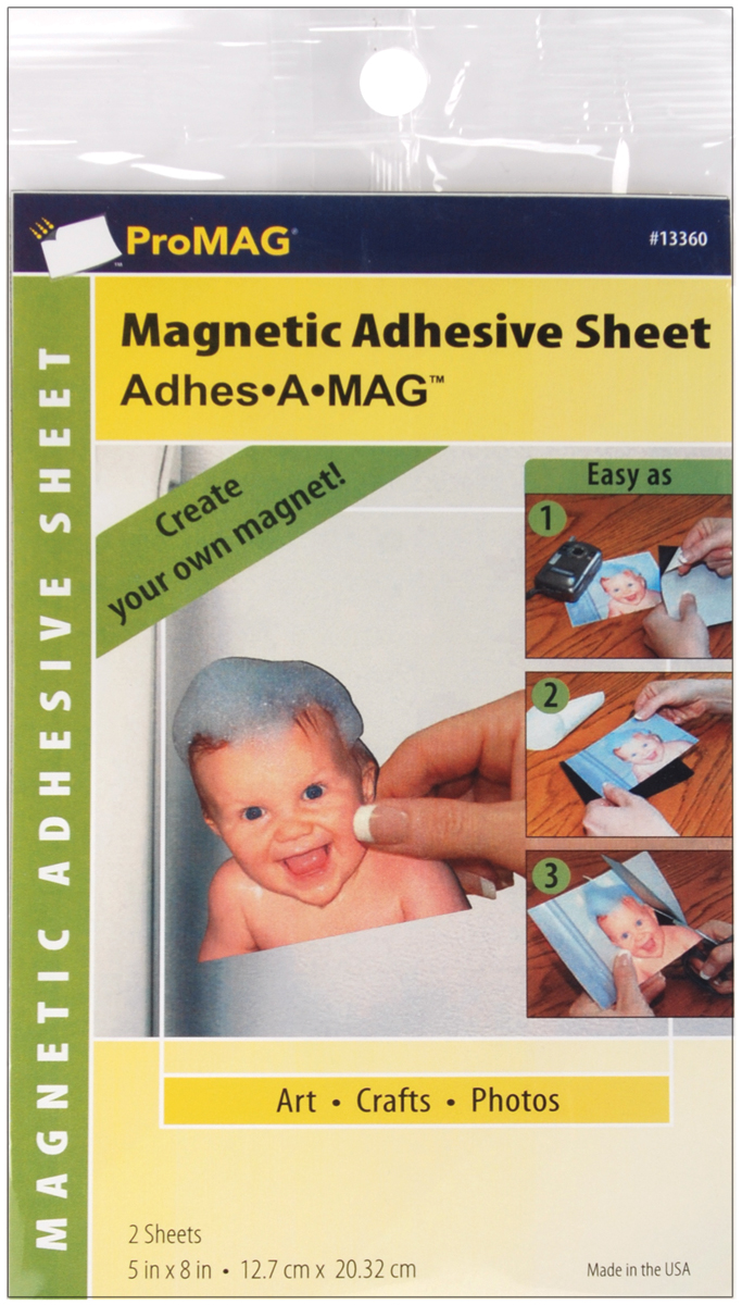 MAGNUM MAGNETICS-ProMag Adhesive Magnetic Sheet. Create your very own magnet! It's easy: simply peel the backing of the magnet, apply a photo, cut and display. This package contains two 5x8 inch magnetic sheets. Made in USA.