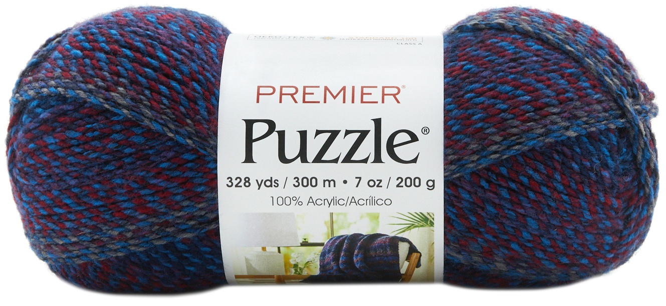 Premier Yarns-Puzzle Yarn. Soft, washable, bulky weight acrylic in spectacular colors-that's Puzzle! Each ball is made with 4 coordinating colors that combine to create ever-changing, softly blended stripes. Weight category: 5. Content: 100% Acrylic. Putup: 7oz/200g, 328yd/300m. Gauge: 15sx20r = 4in/10cm on size US10/6mm knitting needles. Suggested crochet hook size USJ/6mm. Dyelotted: we try but are not always able to match dyelots. Care: Machine wash, machine dry, iron, do not bleach, dry clean using P solvents. Comes in a variety of colors. Each sold separately. Imported.