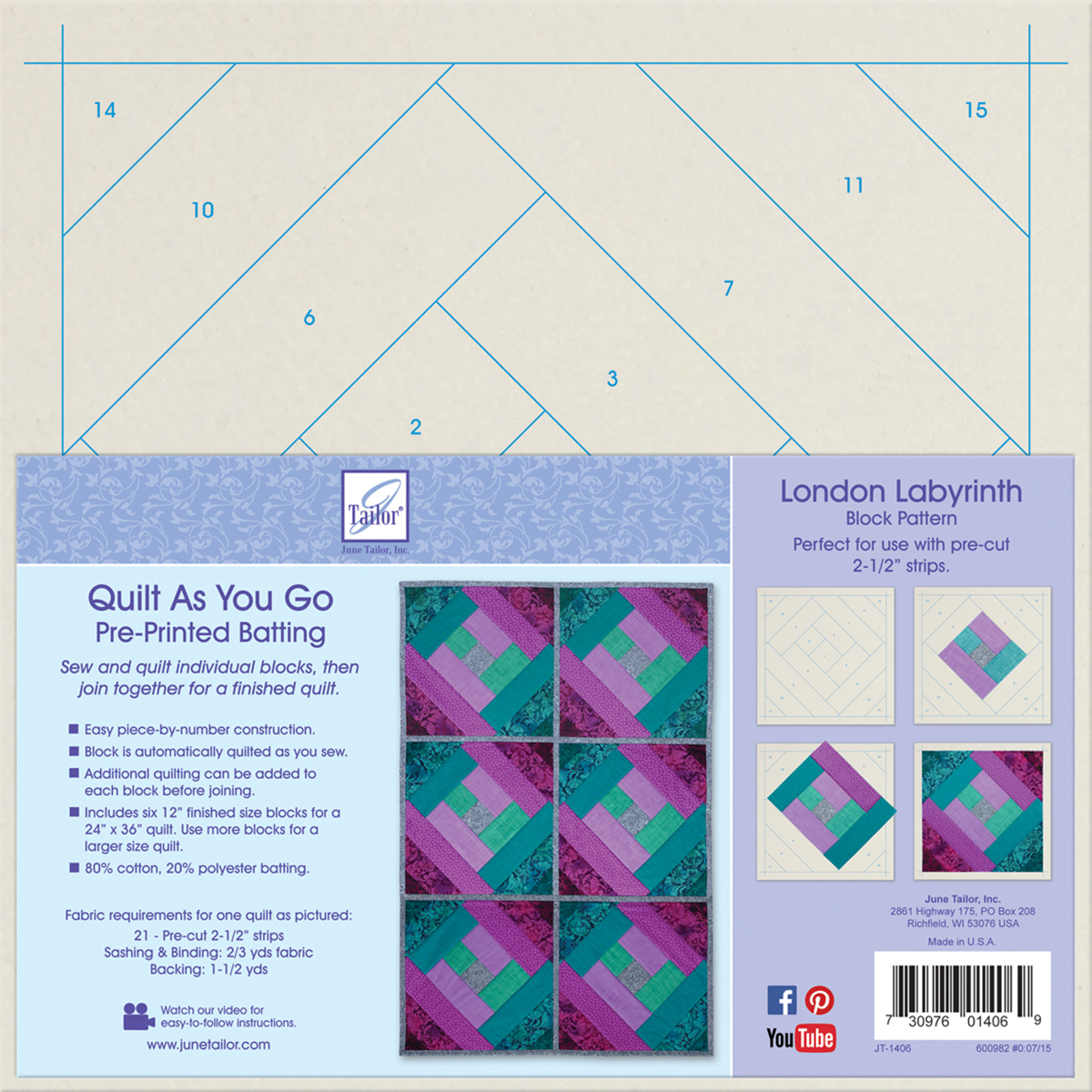 June Tailor Quilt As You Go. A 24 x 36 quilt pre-printed batting. Complete this easy piece-by-number quilt in a fraction of the time of traditional quilting. Designed for 2-1/2 fabric strips. This package contains one 24 x 35 batting made of 80% cotton and 20% polyester, and fabric requirements for London Labyrinth. Made in the USA.